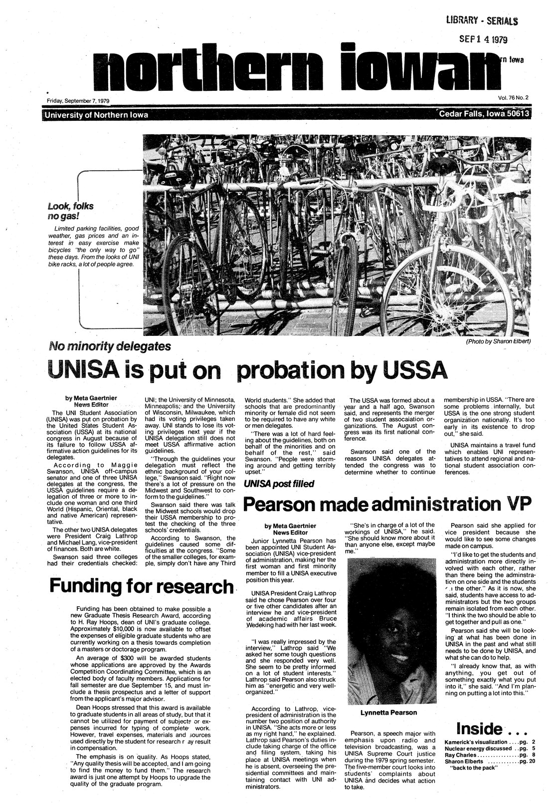 | Look, folks, no gas! | Many UNI students are taking the cheap way to get around by using a bicycle; photo. |
