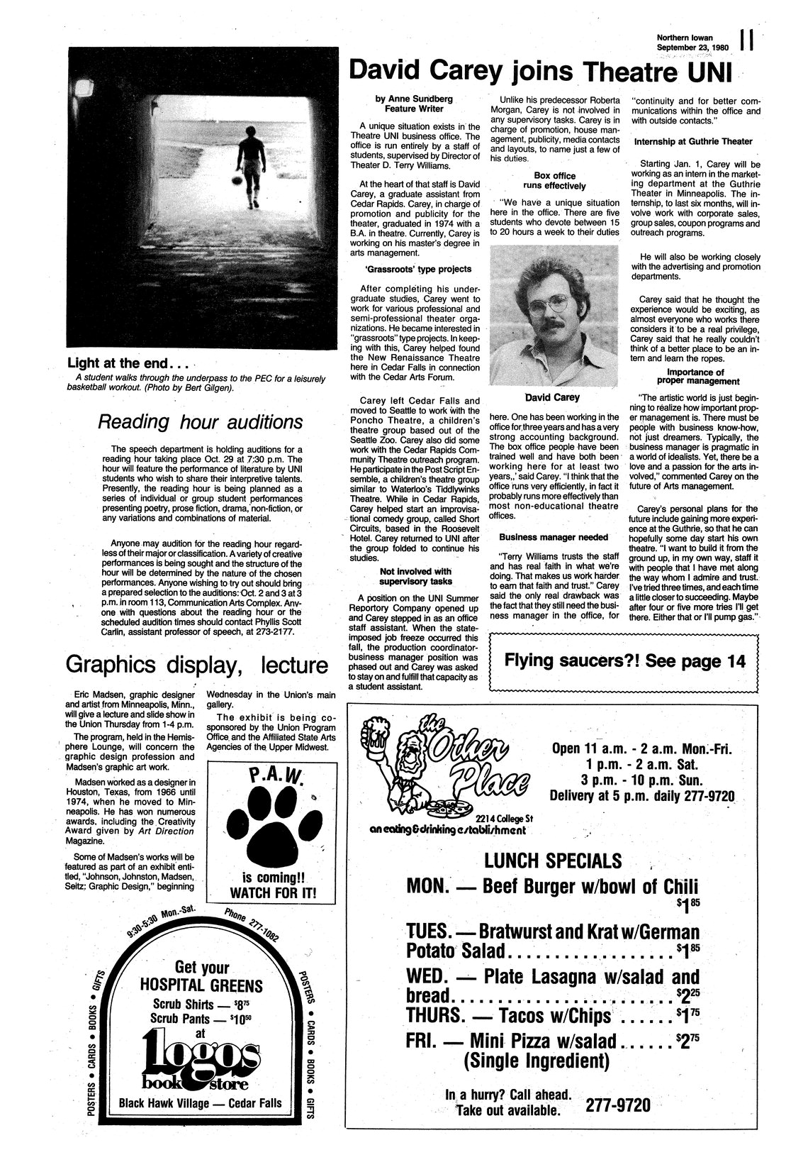 | David Carey joins Theatre UNI | Profile of David Carey, who will be in charge of promotion and publicity; photo. |