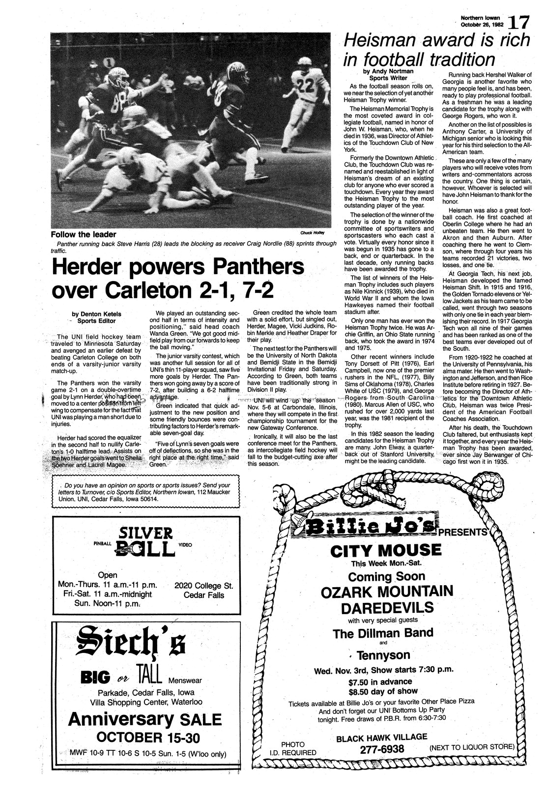 | Herder powers Panthers over Carleton 2-1, 7-2 | UNI defeated Carleton College in the varsity and junior varsity games. |