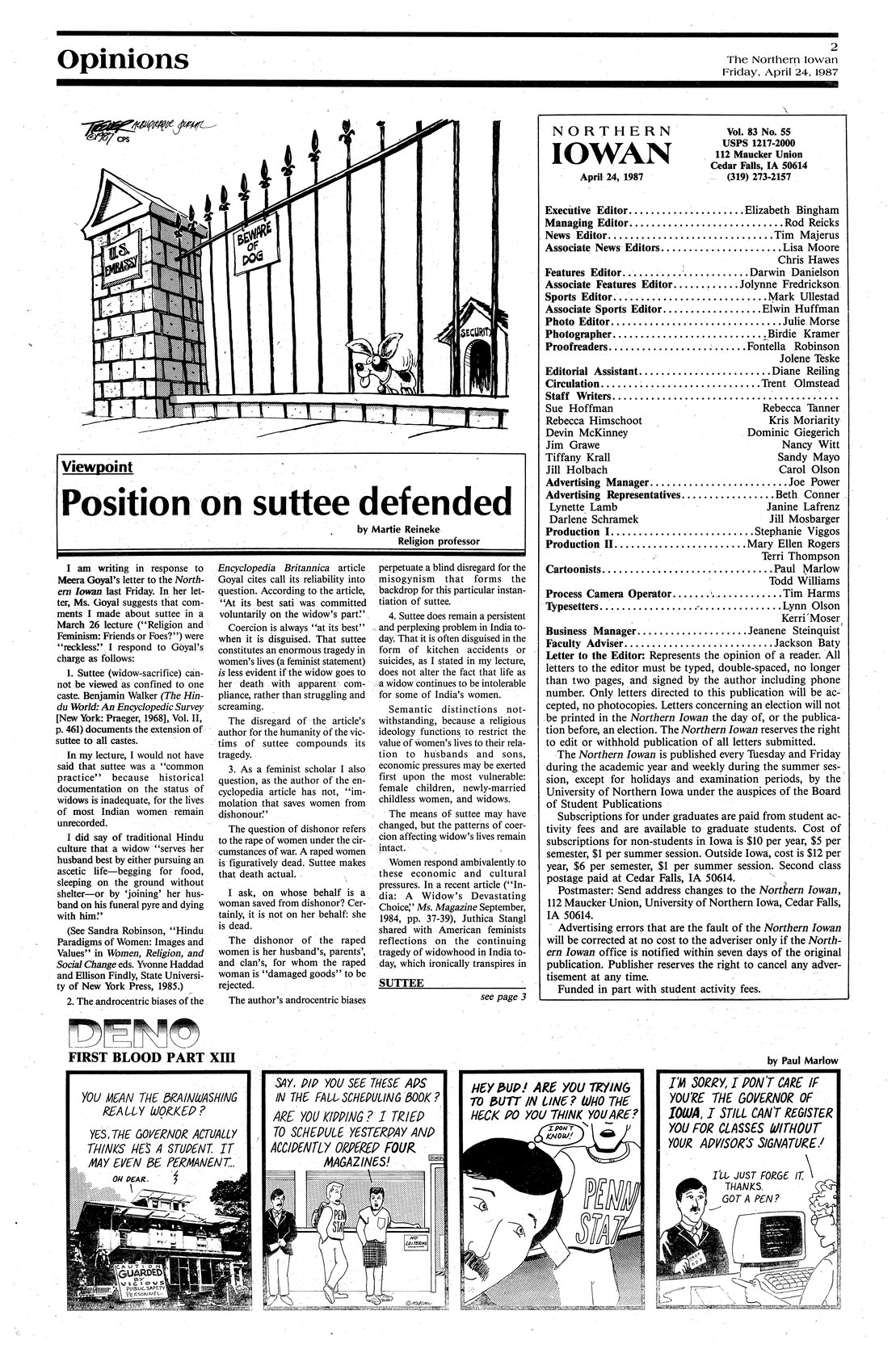 | Position on suttee defended | Professor Reineke defends her recent lecture on Indian widow sacrifice. |