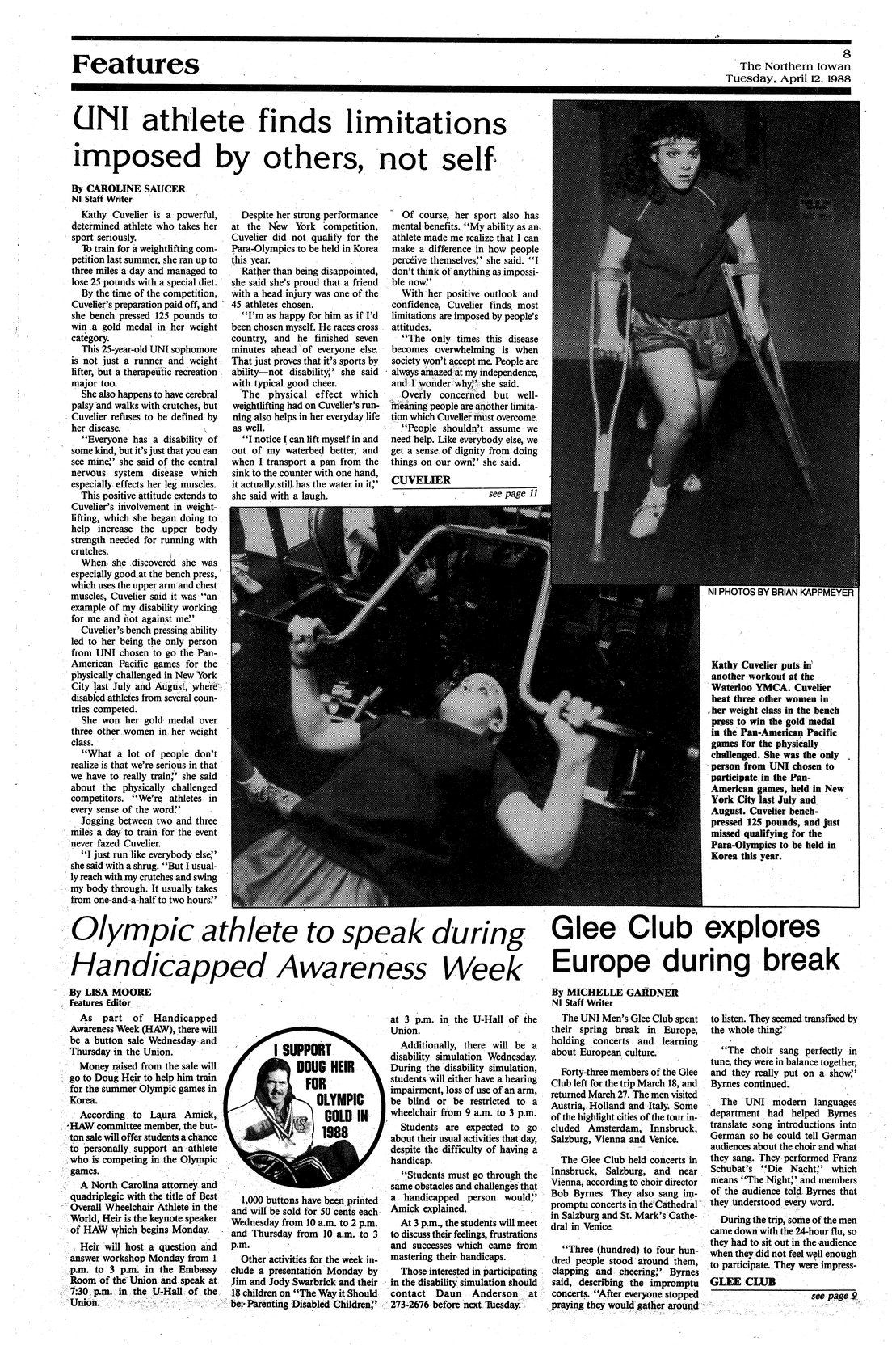UNI athlete finds limitations imposed by others, not self Profile of Kathy Cuvelier; photo.