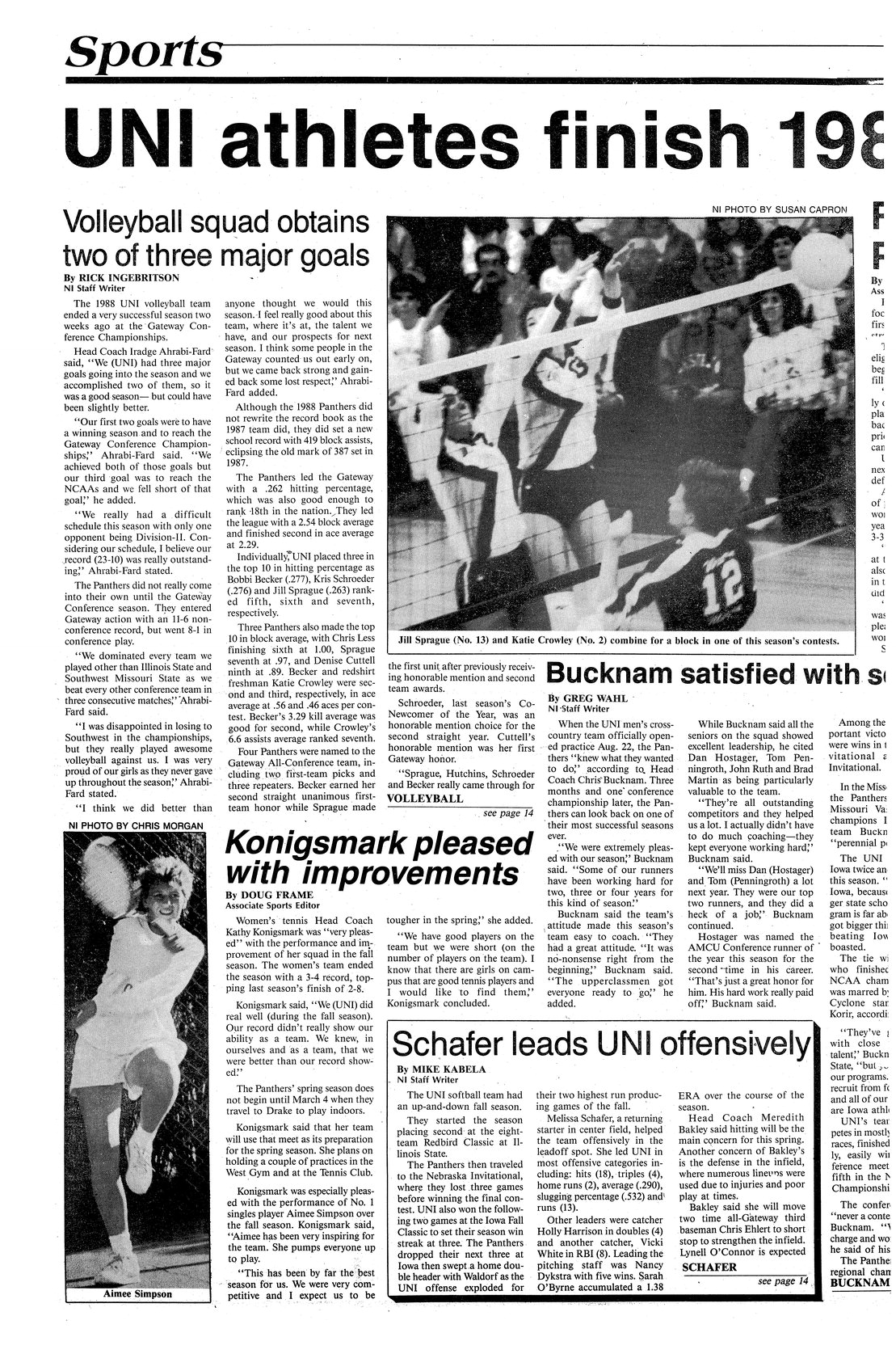 UNI athletes finish1988 fall sports schedules; Volleyball squad obtains two of three major goals Panthers finished season at the Gateway Conference tournament; photo.