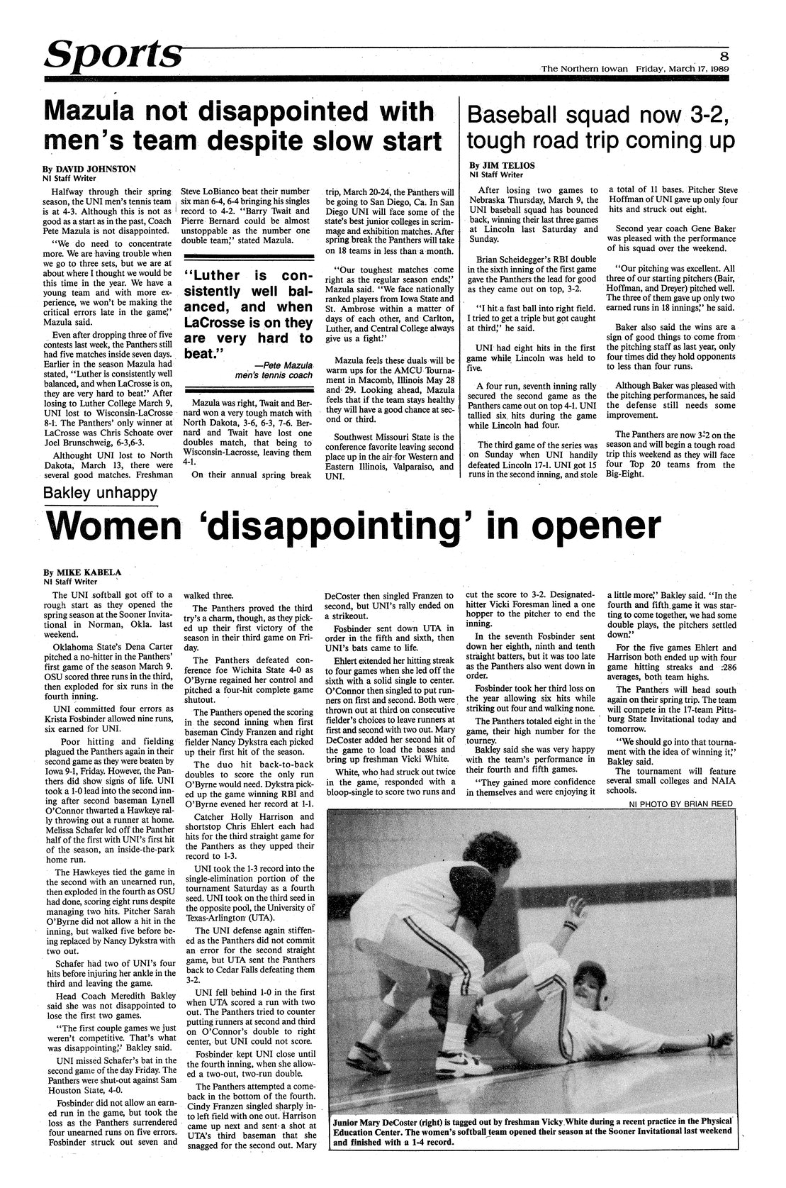 | Women "disappointing" in opener; Bakely unhappy | UNI softball coach Meredith Bakley happy with performance during the fourth and fifth games of the Sooner Invitational; photo. |