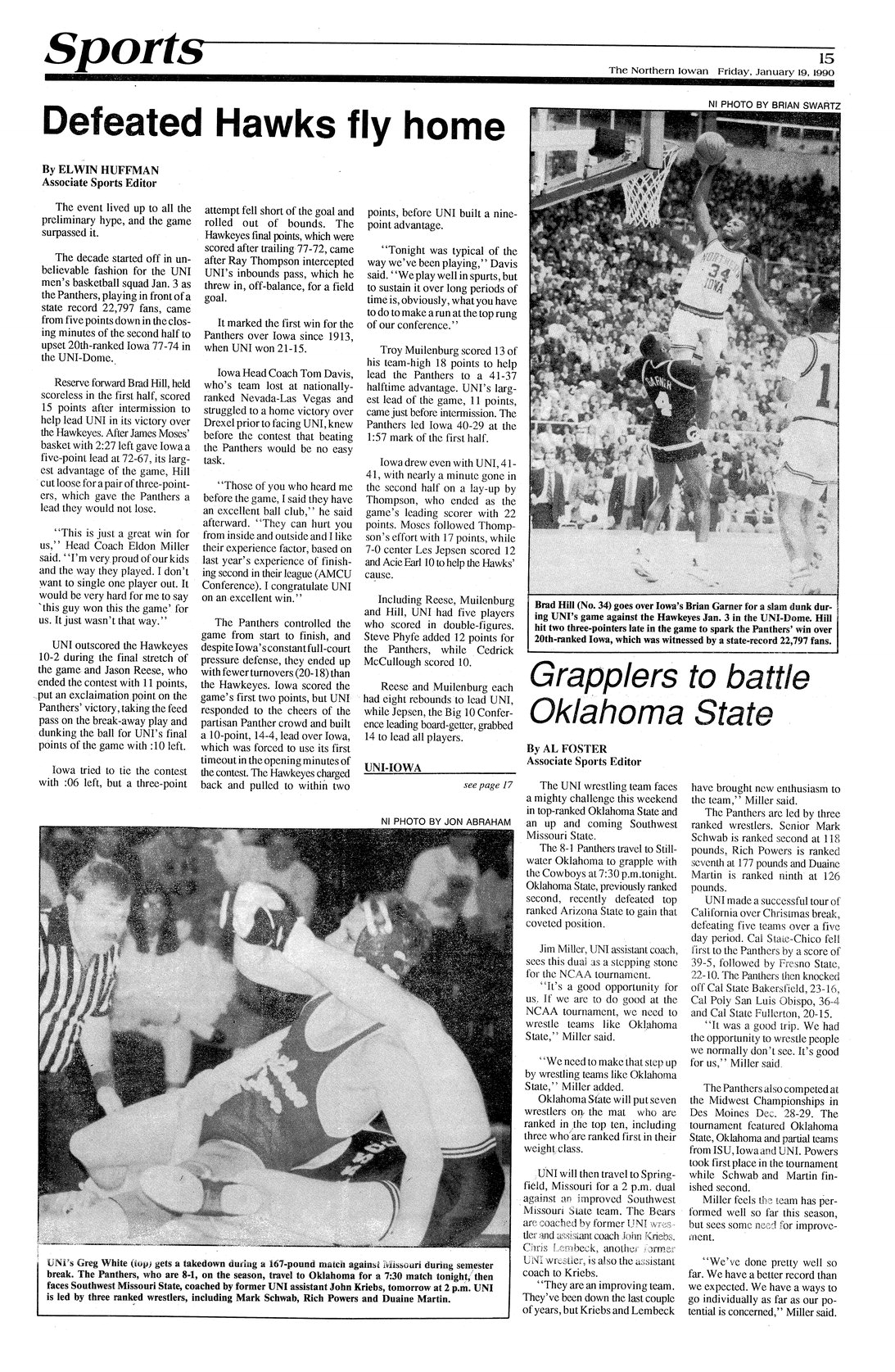Defeated Hawks fly home UNI's men's basketball team defeated Iowa, 77-74, for the first time since 1913; photo.