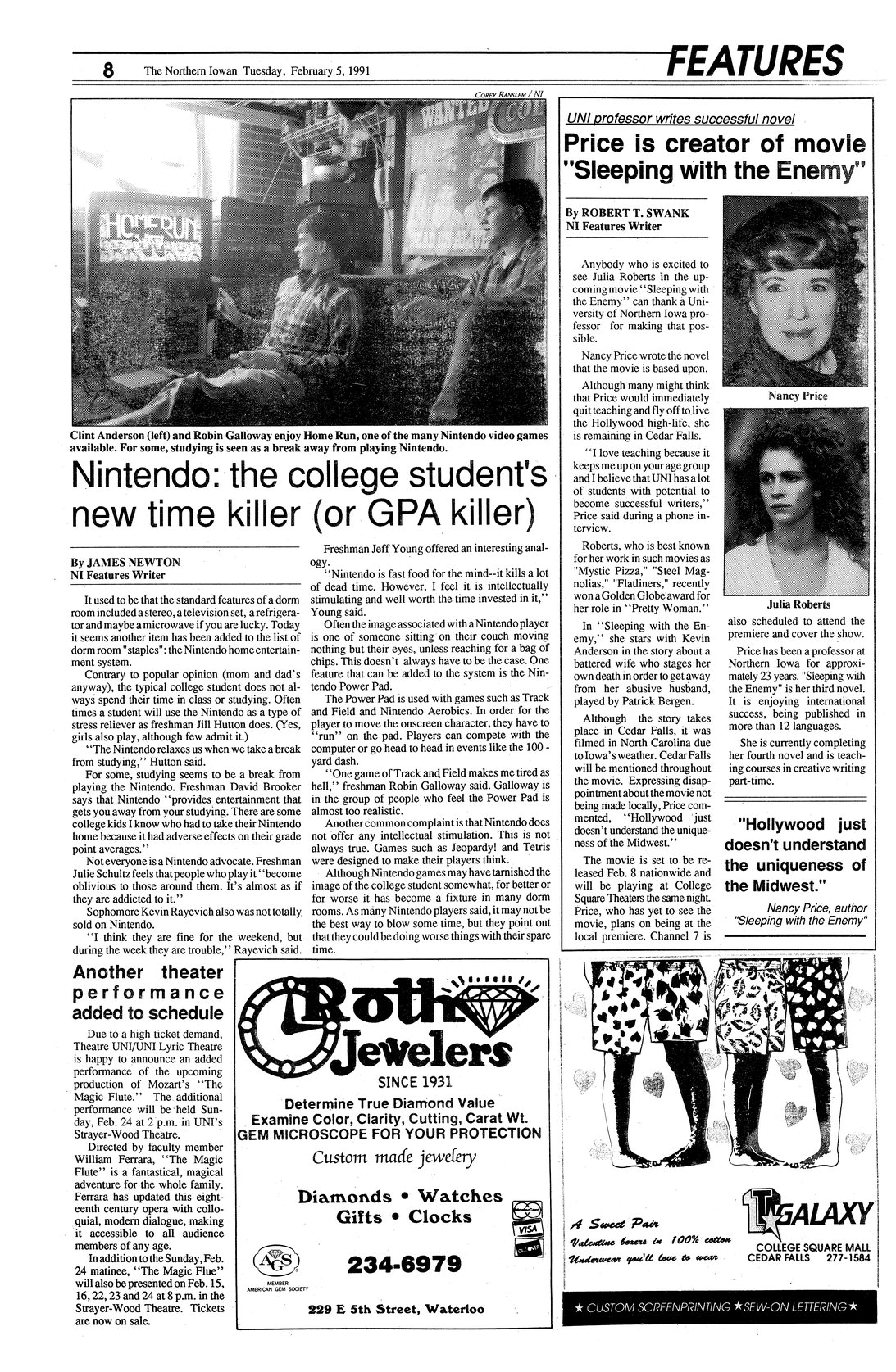 Price is creator of movie "Sleeping with the Enemy"; UNI professor writes successful novel Nancy Price is author of the book, "Sleeping with the Enemy", which will be released as a movie February 8; photo.