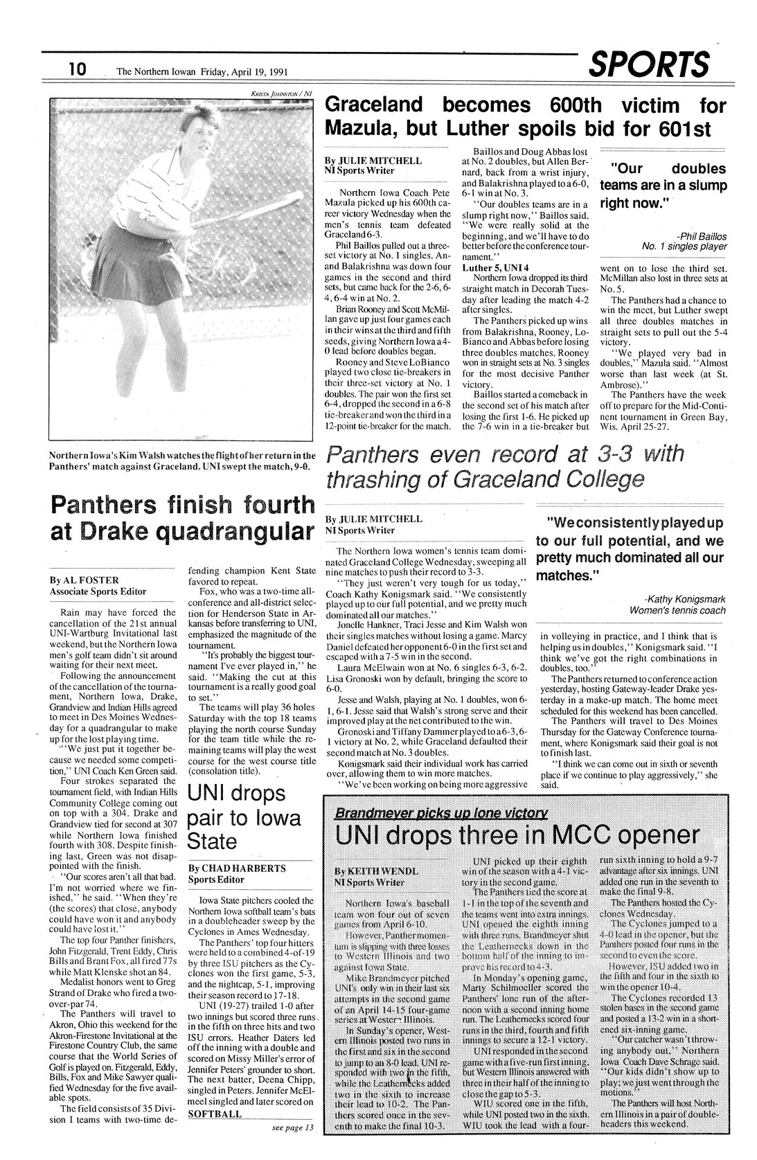 | Graceland becomes 600th victim for Mazula, but Luther spoils bid for 601st | Luther takes away the 601st win for the UNI men's tennis coach on Wednesday. |