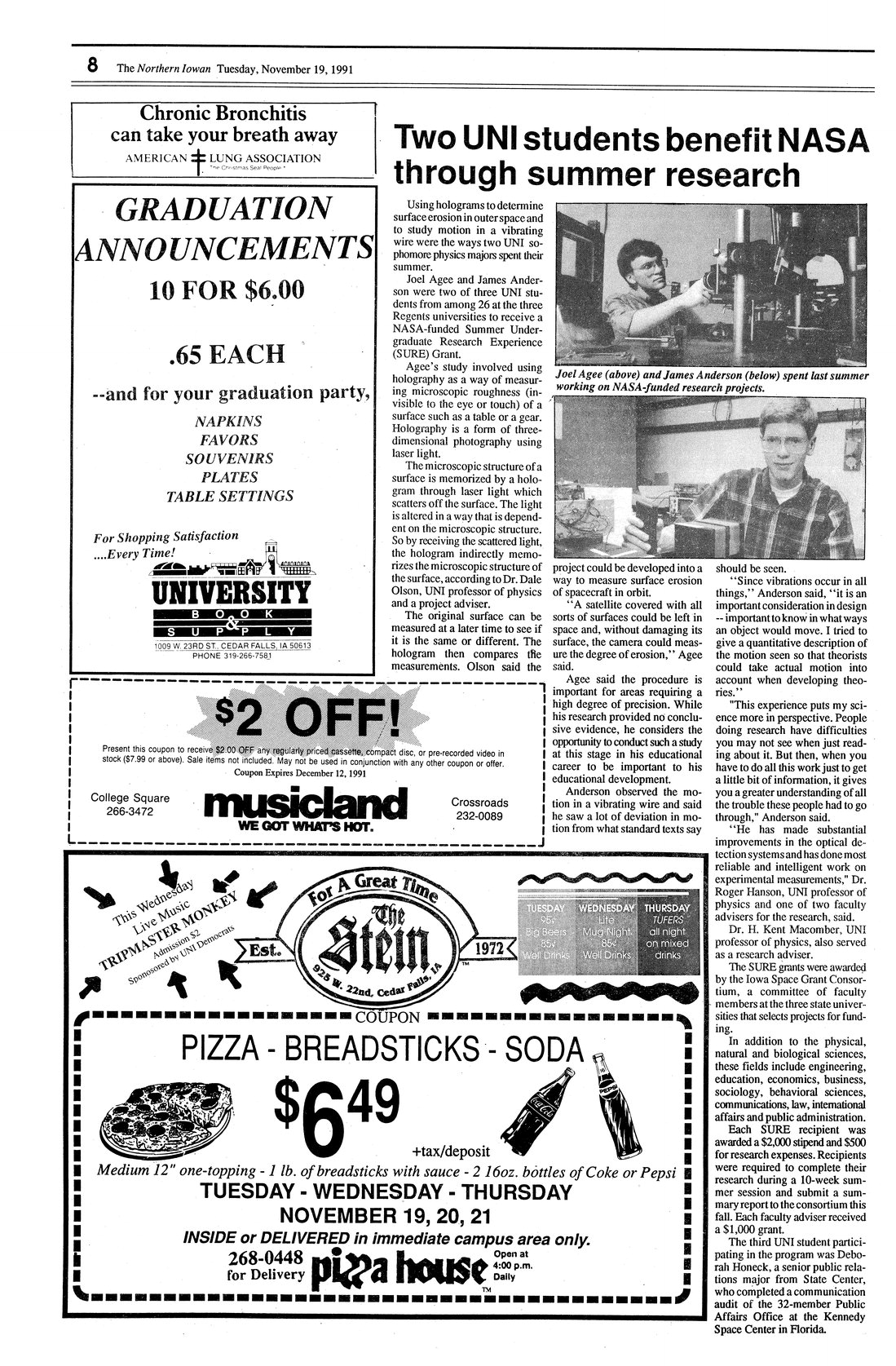 | Two UNI students benefit NASA through summer research | Joel Agee and James Anderson talk about their research; photo. |
