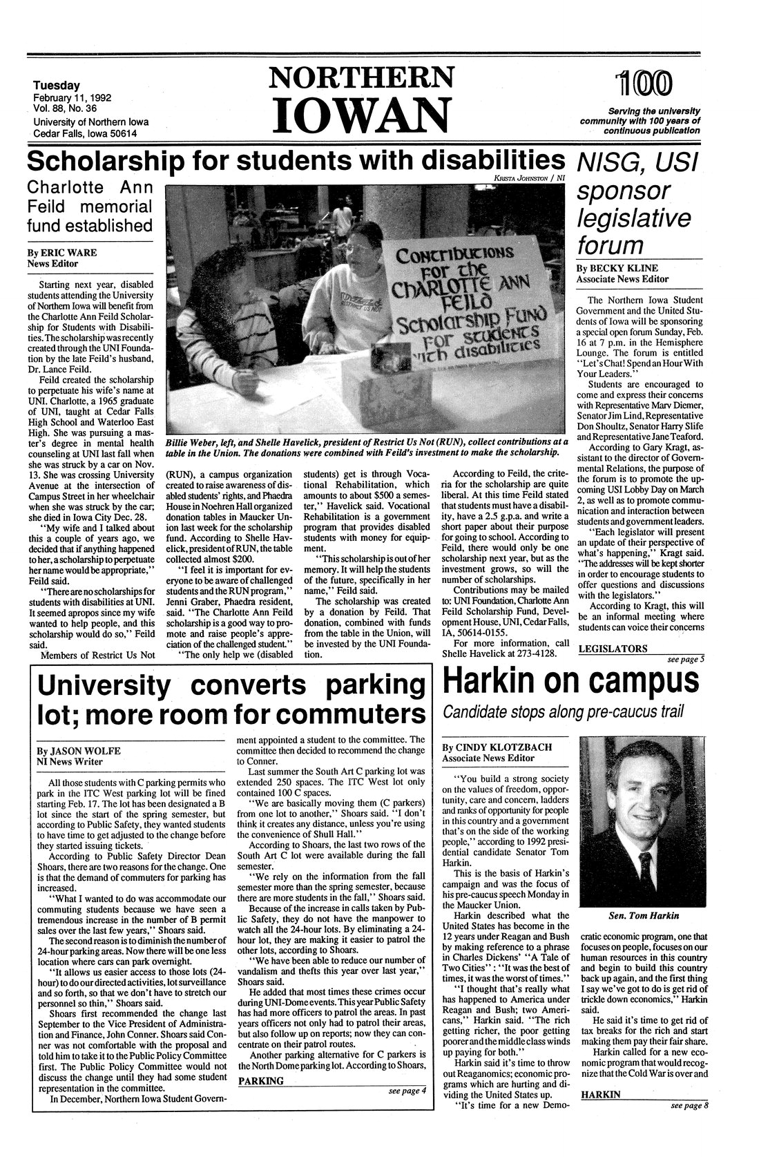 Harkin on campus; candidate stops along pre-caucus trail Excerpts from speech; photo.