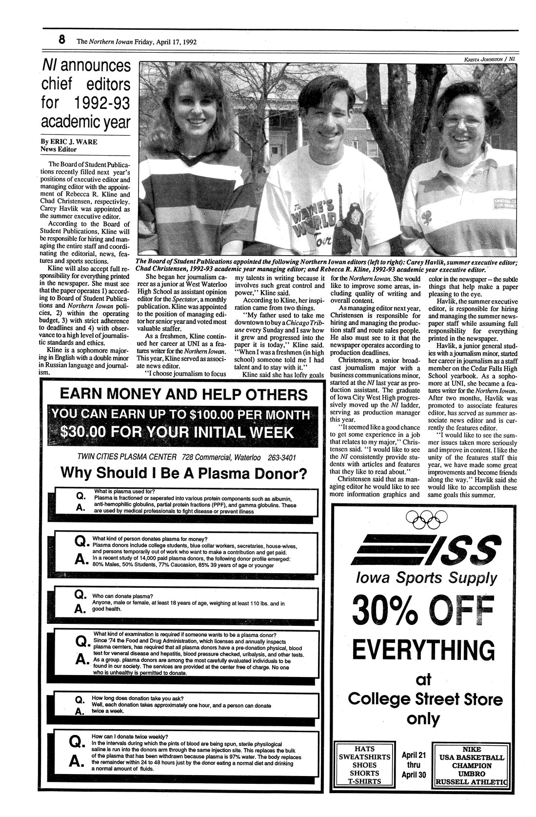 NI announces chief editors for 1992-93 academic year Rebecca Kline will be executive editor; Chad Christensen will be managing editor; Carey Havlik will be summer executive editor; photo.