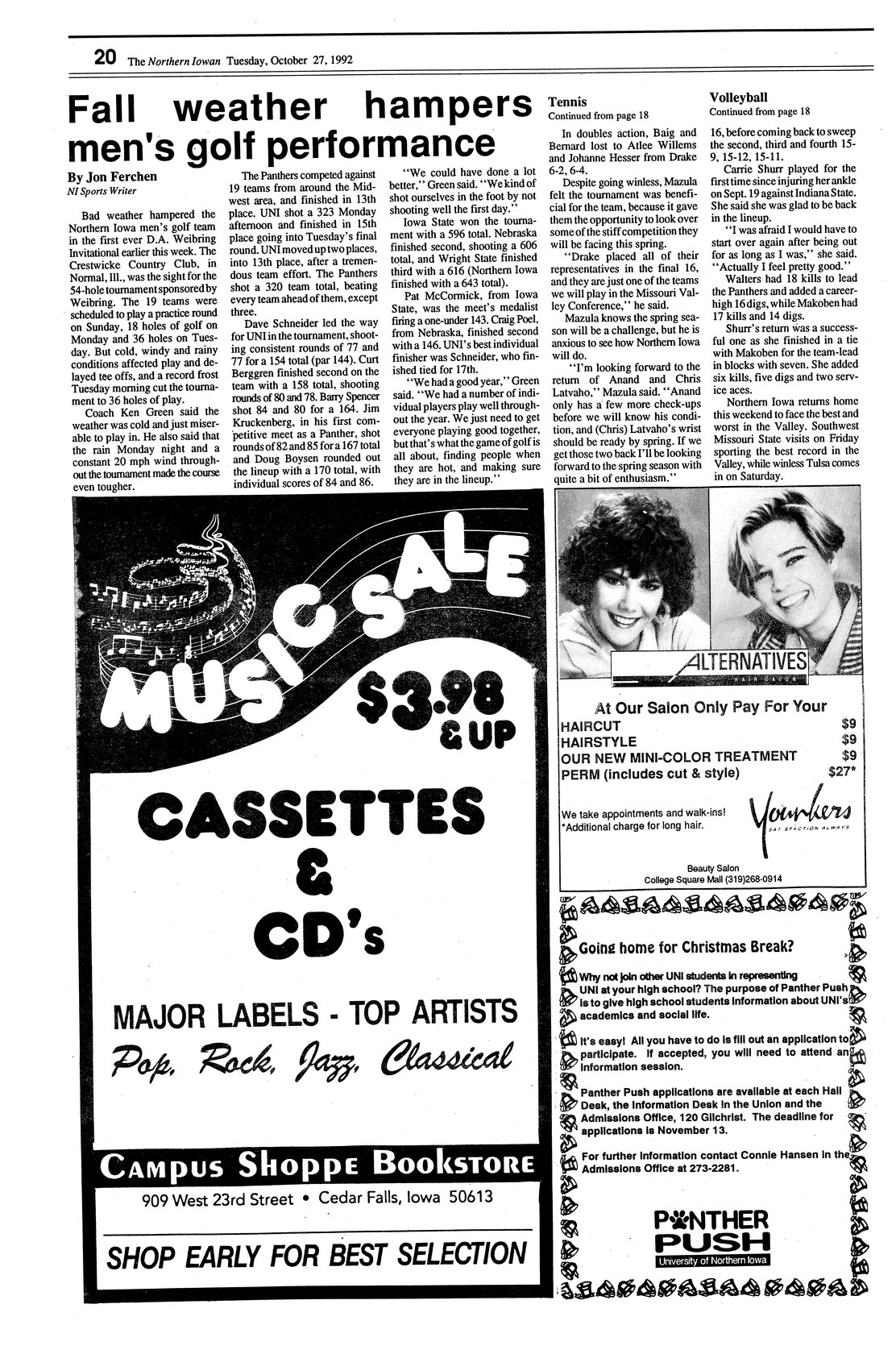 | Fall weather hampers men's golf performance | UNI finishes thirteenth out of nineteen teams in the D. A. Weibring Invitational. |