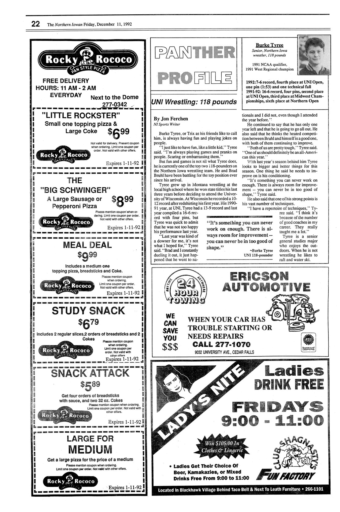 UNI Wrestling: 118 pounds Panther Profile of wrestler Burke Tyree; photo.
