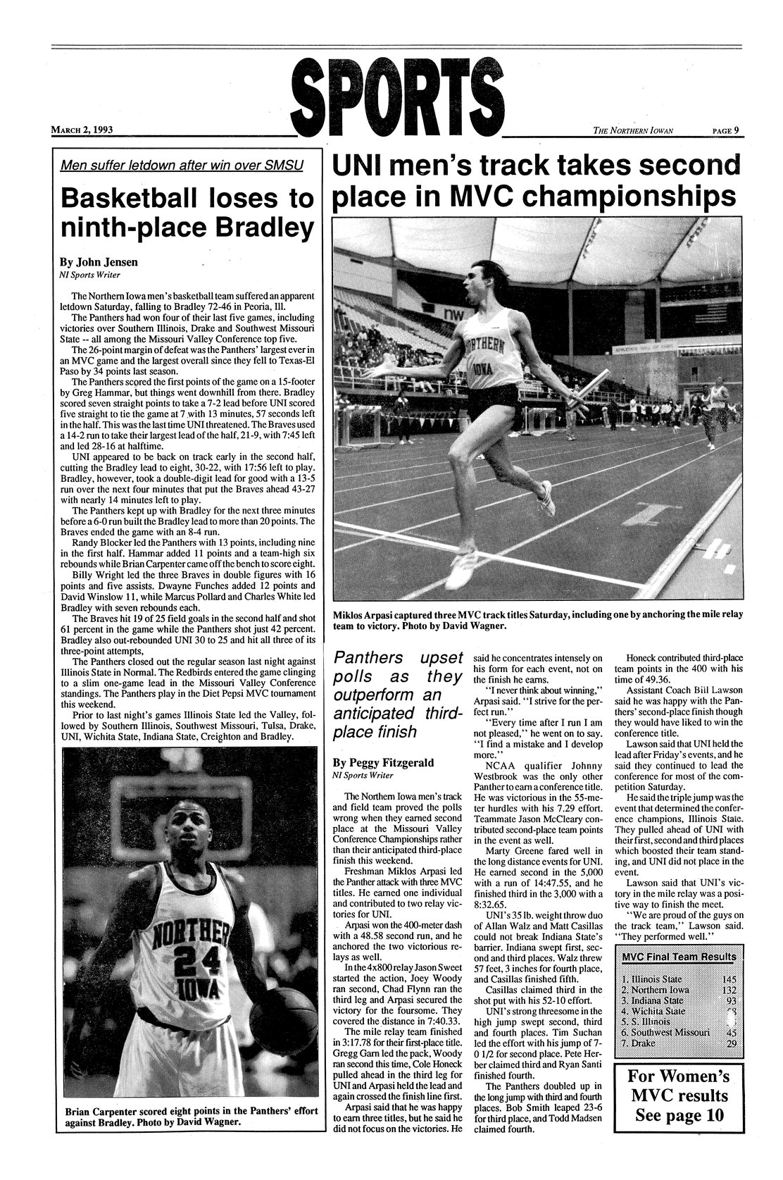 | Basketball loses to ninth-place Bradley; men suffer letdown after win over SMSU | Bradley outscores UNI, 72-46; photo. |