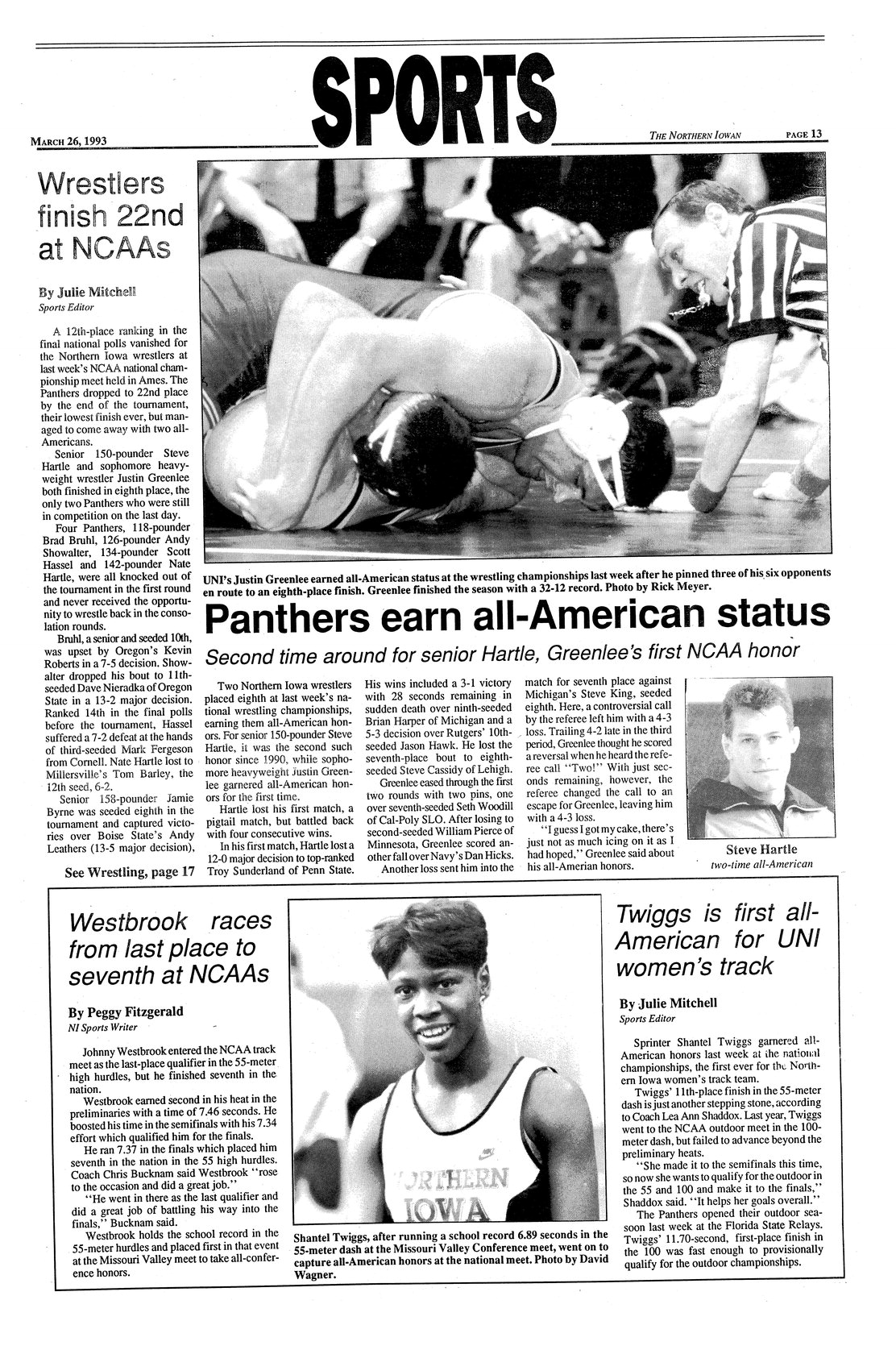 | Panthers earn All-American status; second time around for senior Hartle, Greenlee's first NCAA honor | Two UNI team members, Steve Hartle and Justin Greenlee, earned all-American status at last weeks national tournament; photo. |