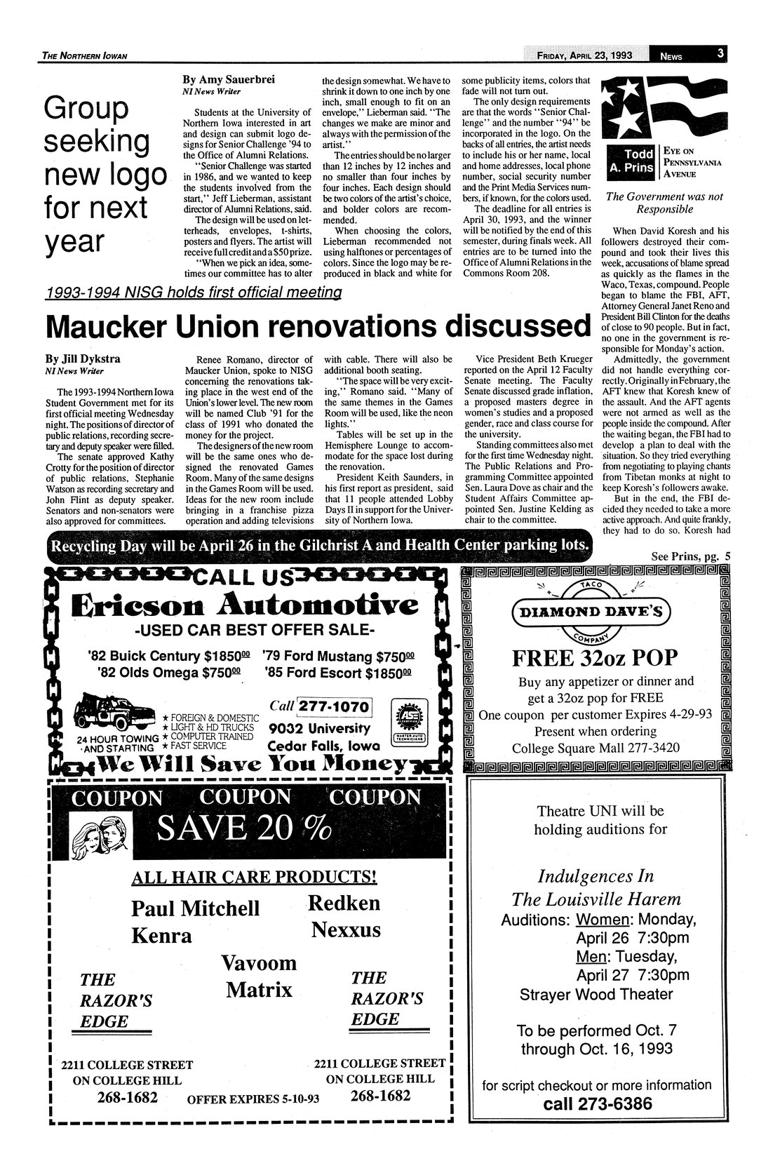 | Maucker Union renovations discussed; 1993-1994 NISG holds first official meeting | Officers elected; Renee Romano speaks about developing Club '91 and other renovations. |