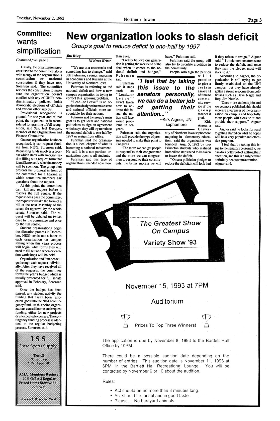| New organization looks to slash deficit; group's goal to reduce deficit to one-half by 1997 | Lead . . . Or Leave movement forms on campus. |