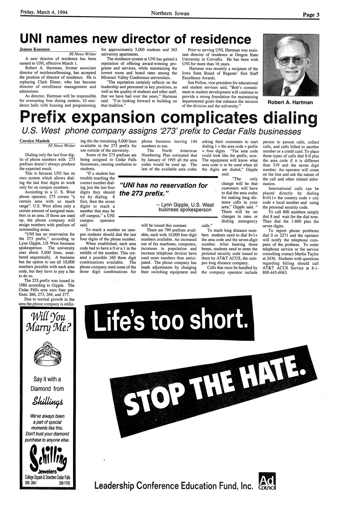 | Prefix expansion complicates dialing; U.S. West phone company assigns "273" prefix to Cedar Falls businesses | Company running out of numbering possibilities. |