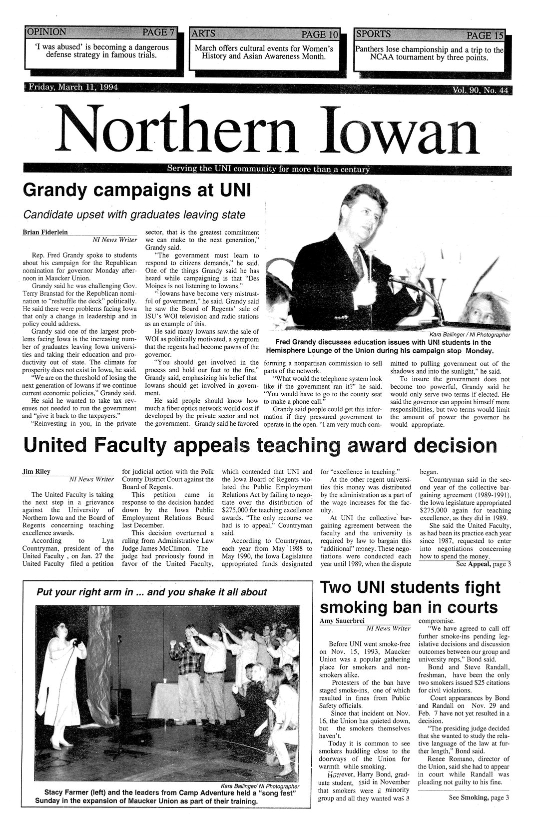 | Grandy campaigns at UNI: candidate upset with graduates leaving state | Fred Grandy speaks in Union; photo. |
