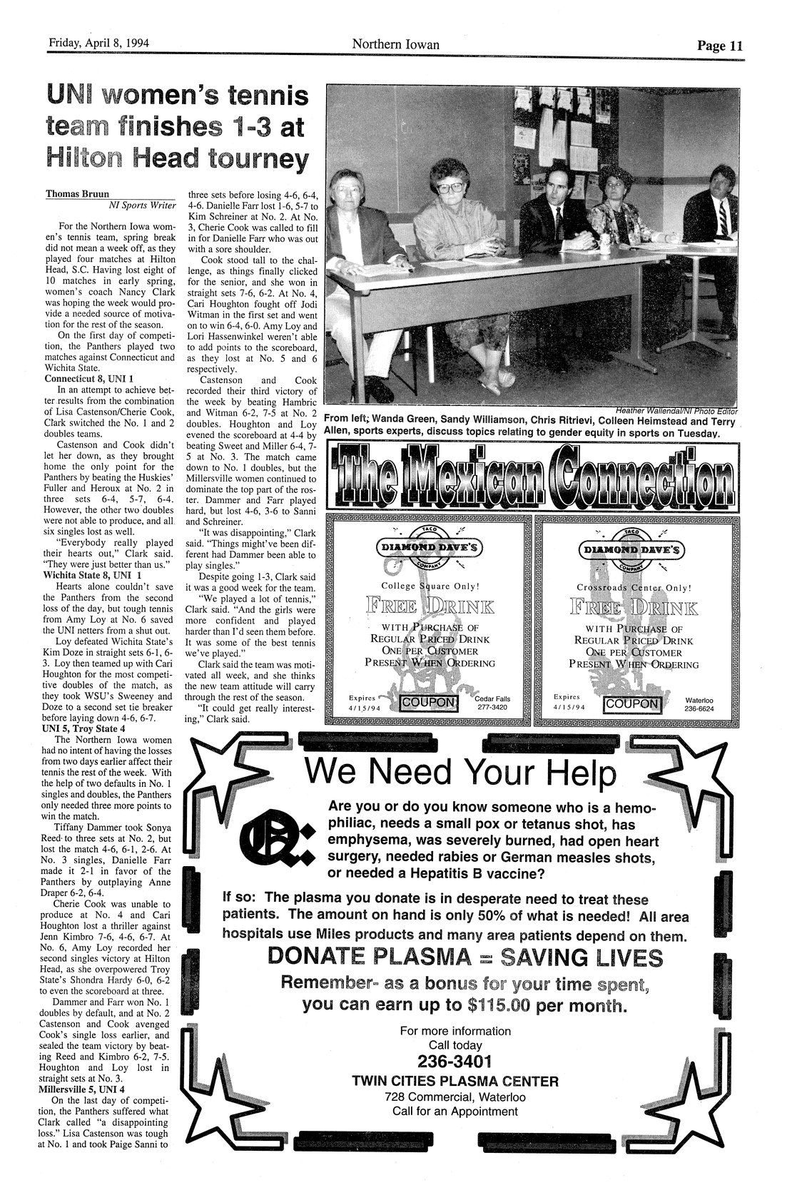 | UNI women's tennis team finishes 1-3 at Hilton Head tourney | UNI has tough spring break, losing three of four matches. |
