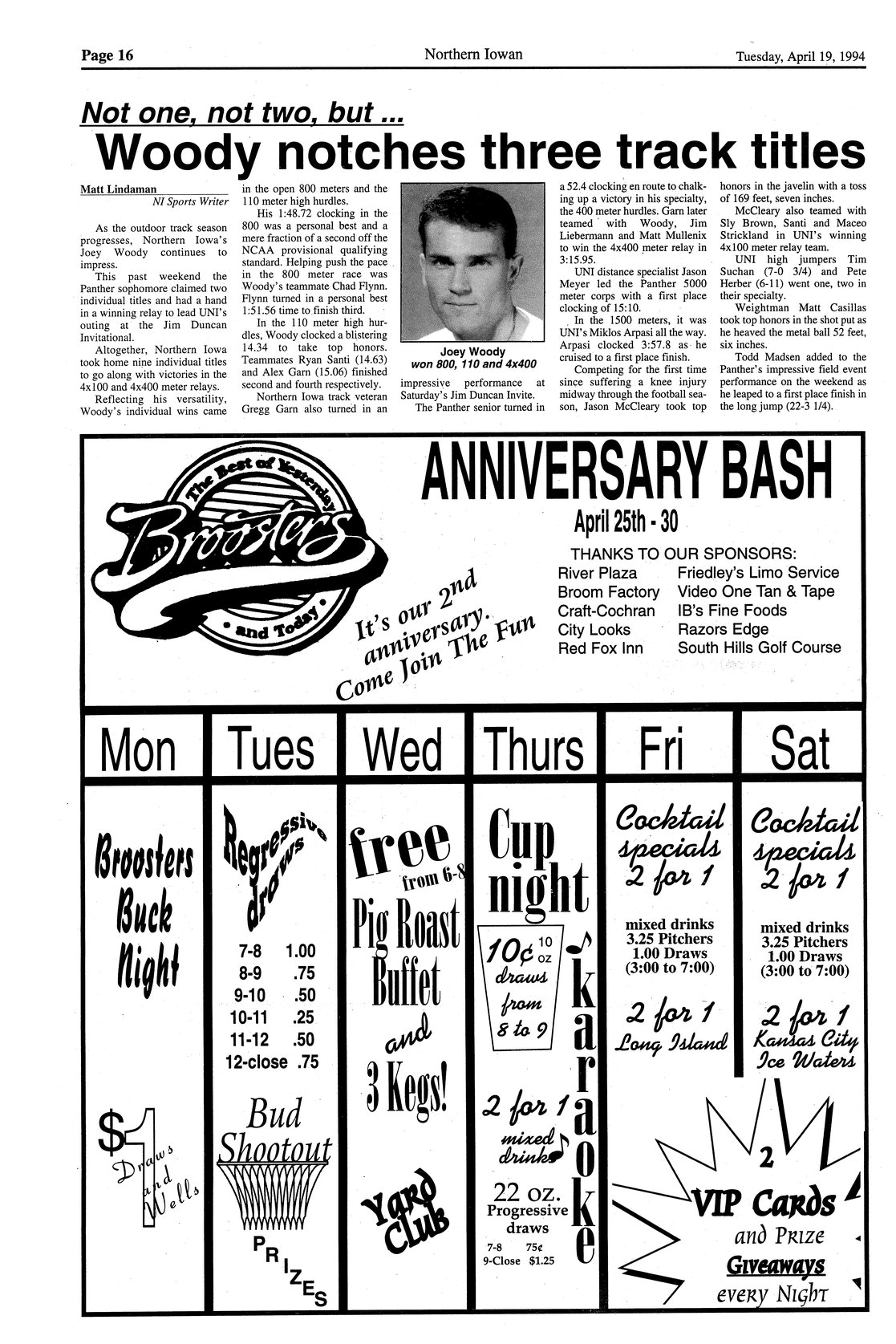 | Woody notches three track titles; not one, not two, but . . . | Track star Joey Woody turns in first place performances in the 800, 110, and the 4 X 400; photo. |