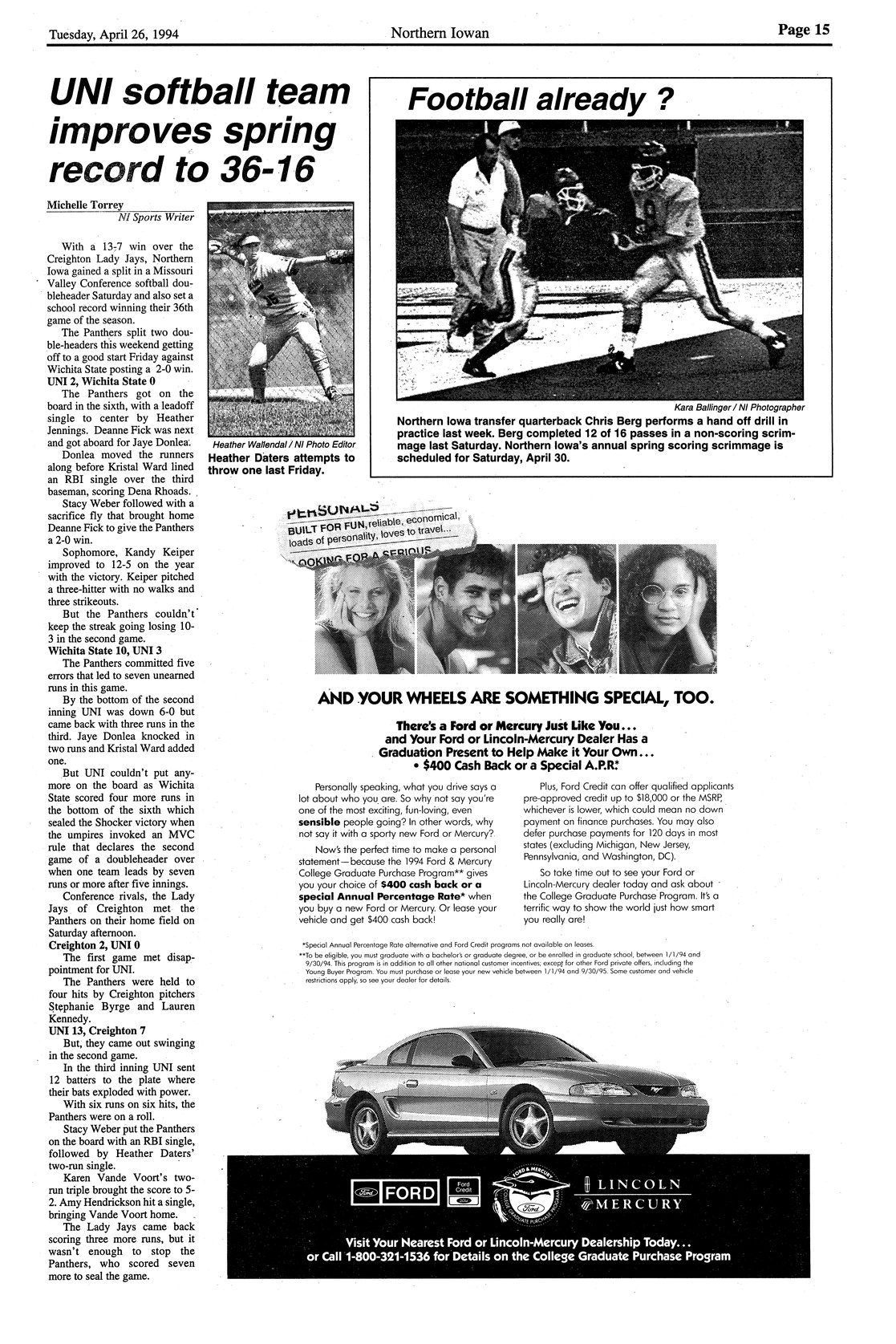 UNI softball team improves spring record to 36-16 Panthers defeated Creighton, 13-7; improved MVC spring record; photo.