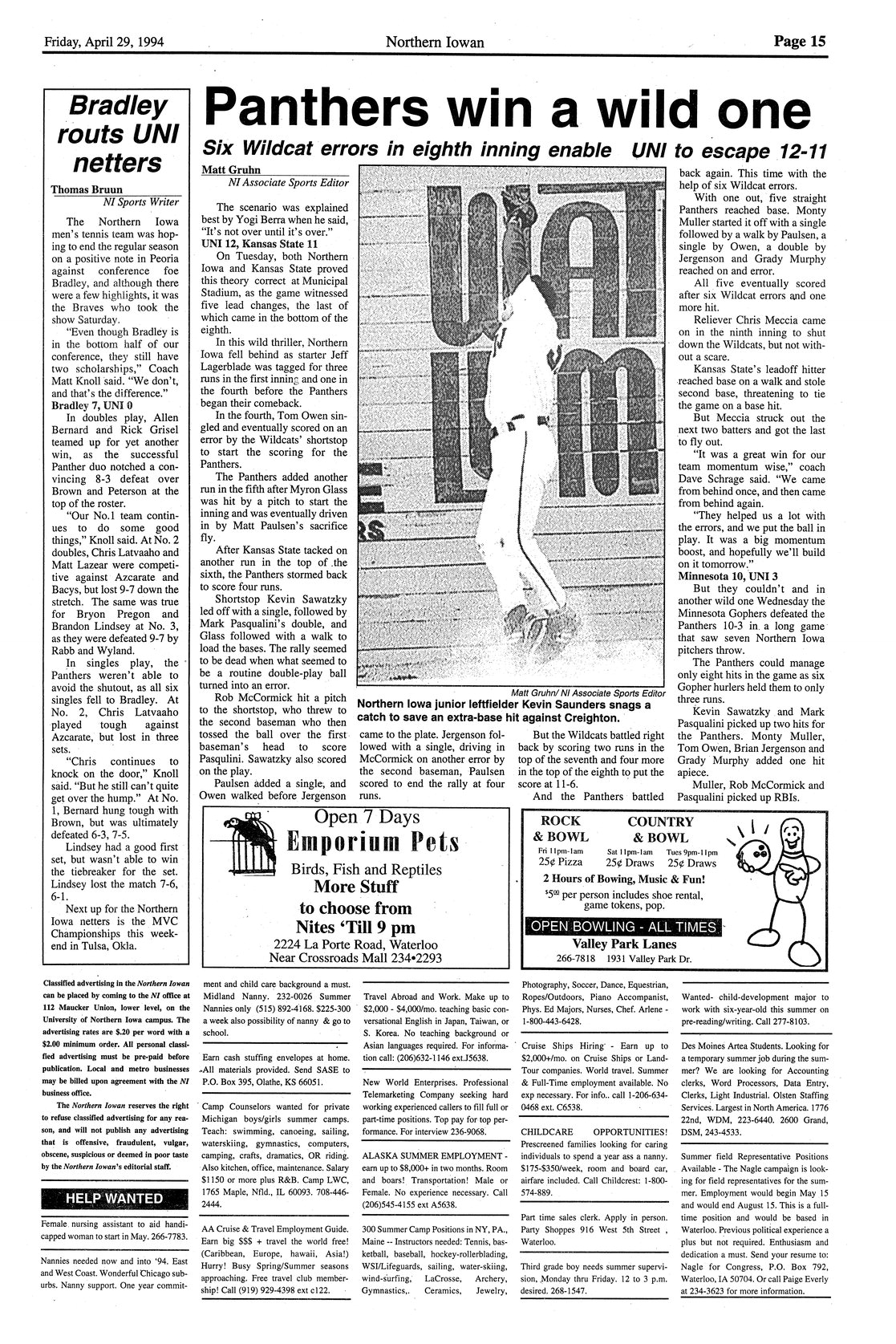 | Panthers win a wild one: six Wildcat errors in eighth inning enable UNI to escape 12-11 | UNI defeated Kansas State, 12-11, and lost to Minnesota, 10-3; photo. |