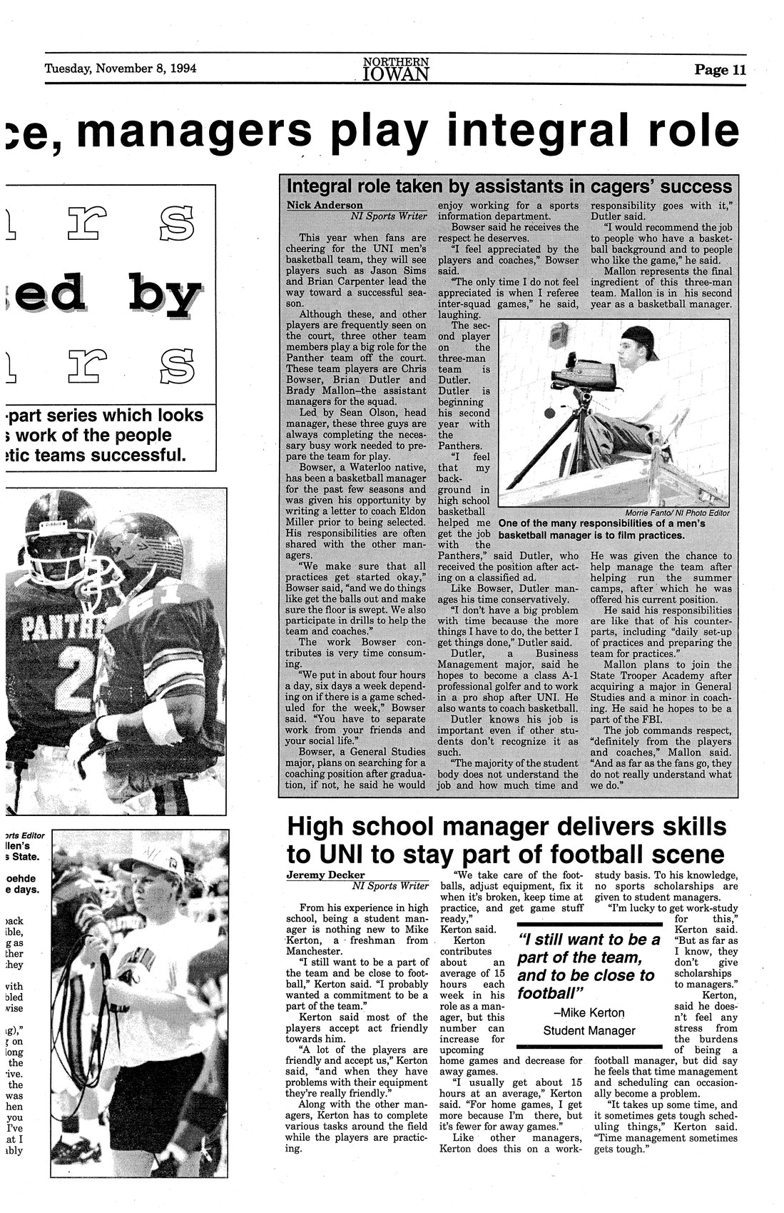 | Integral role taken by assistants in cagers' success | Duties of basketball managers; photo. |