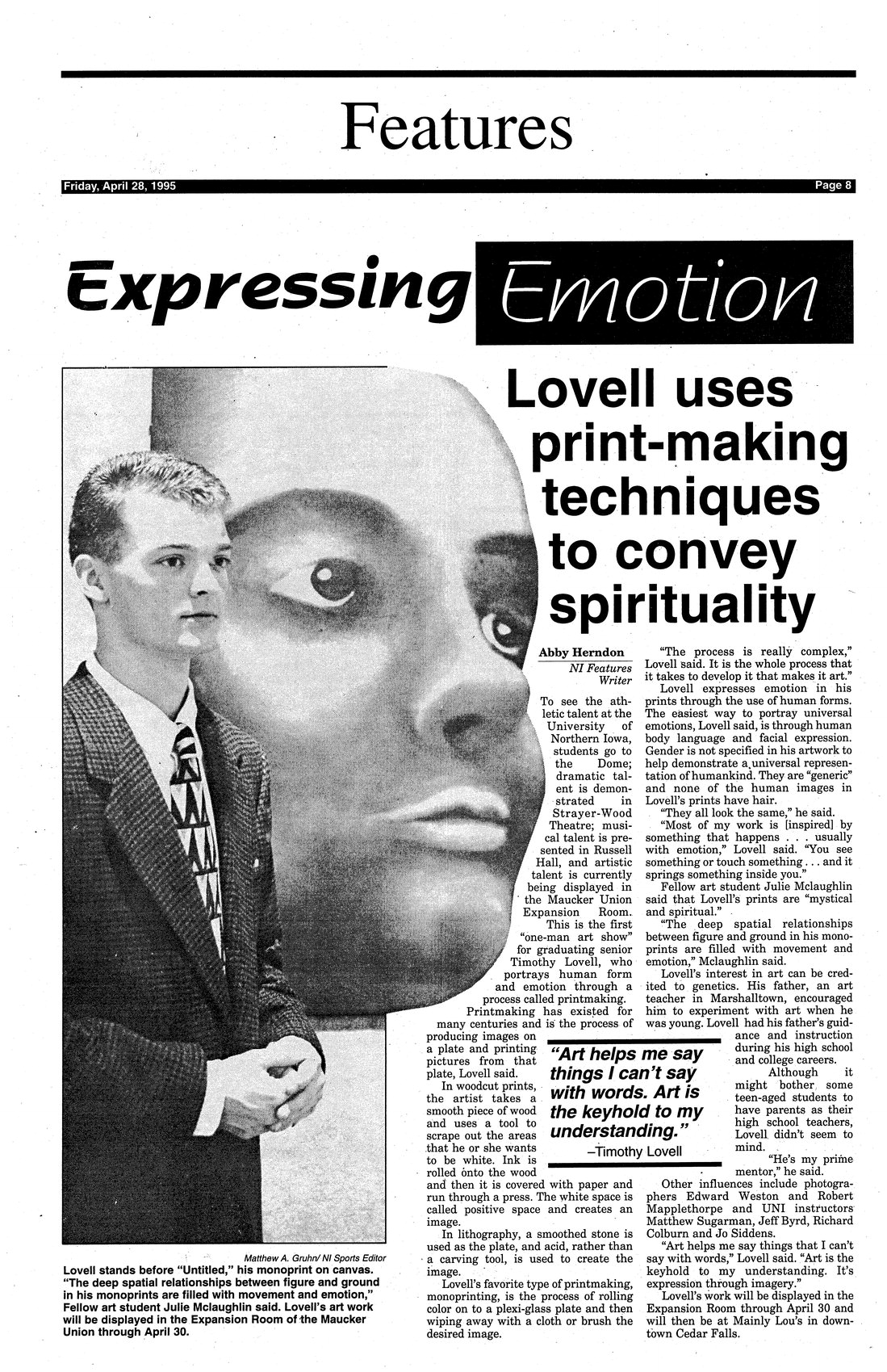 | Lovell uses print-making techniques to convey spirituality | Has one-man show in Union; photo. |