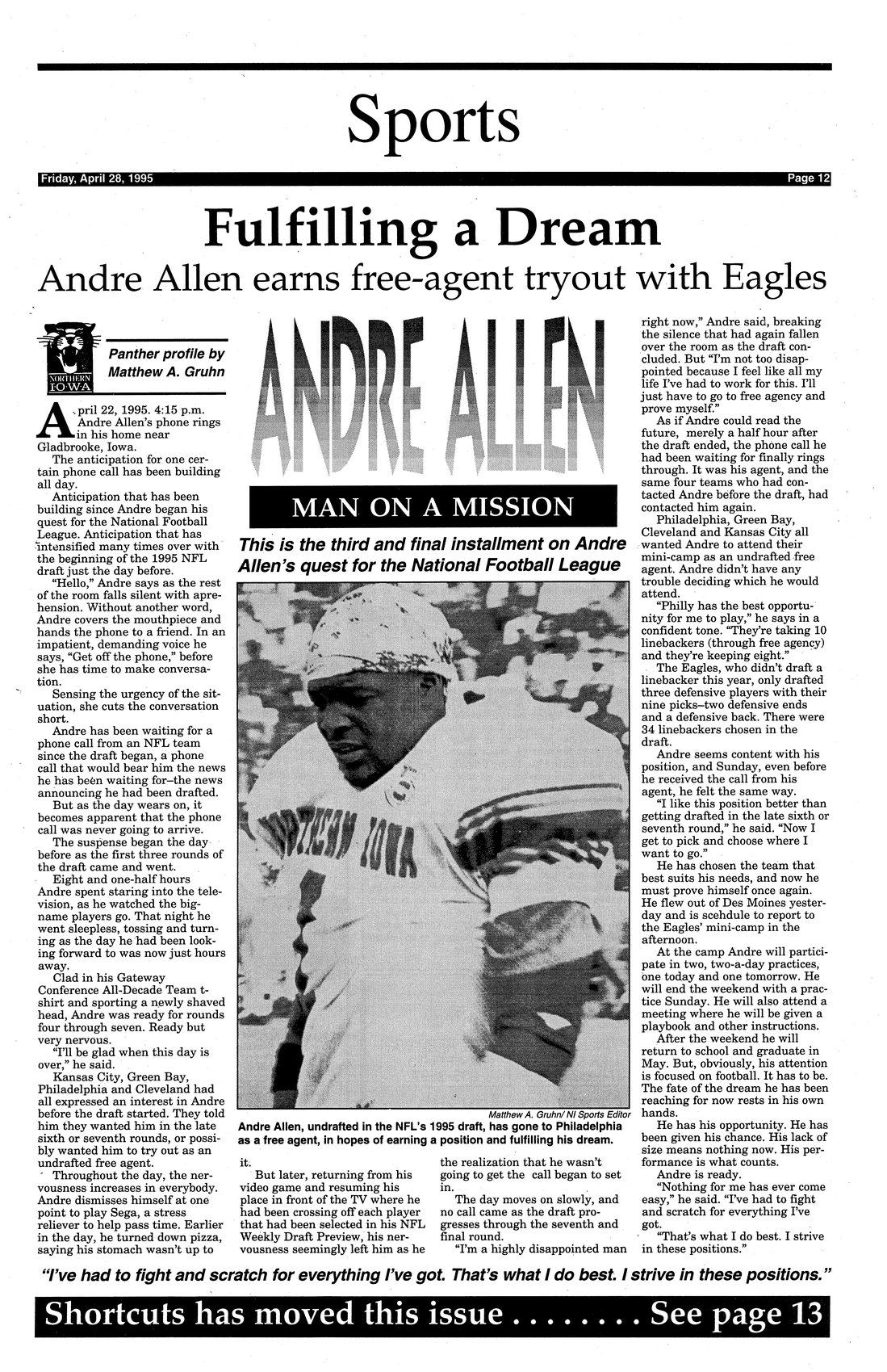 | Andre Allen; man on a mission | This is the third and final installment on Andre Allen's quest for the National Football League; photo. |