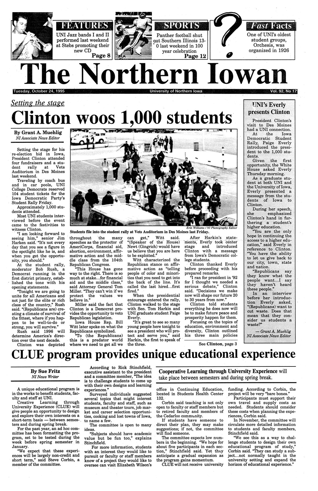 | Clinton woos 1,000 students; setting the stage | UNI students join crowd in Des Moines; photo. |