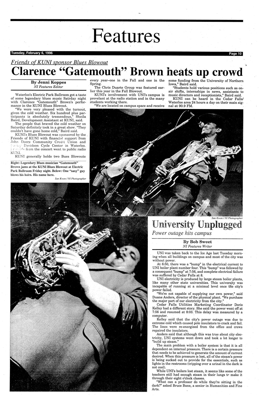 | Clarence "Gatemouth" Brown heats up crowd; friends of KUNI sponsor Blues Blowout | Good turnout despite cold weather; photo. |
