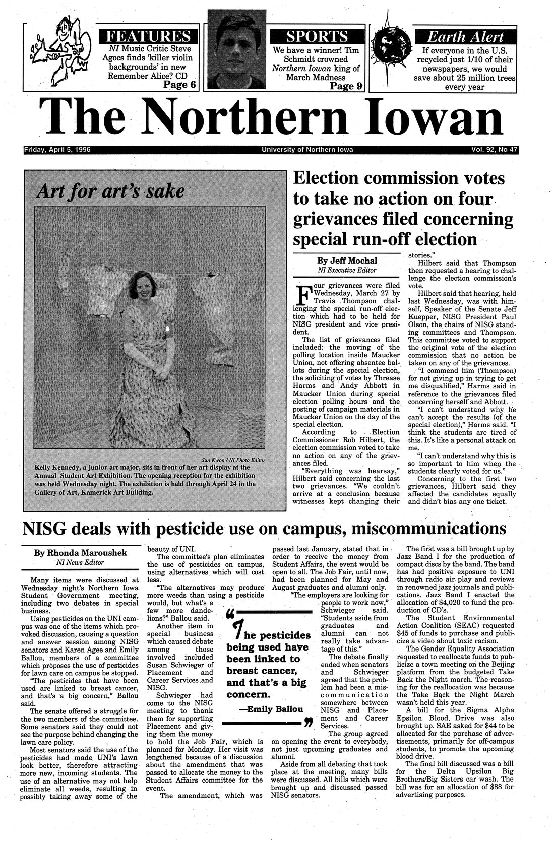 | NISG deals with pesticide use on campus, miscommunications | Considers proposal to ban pesticides on lawn; attempts to straighten out policy on upcoming Job Fair; allocates money to various projects. |