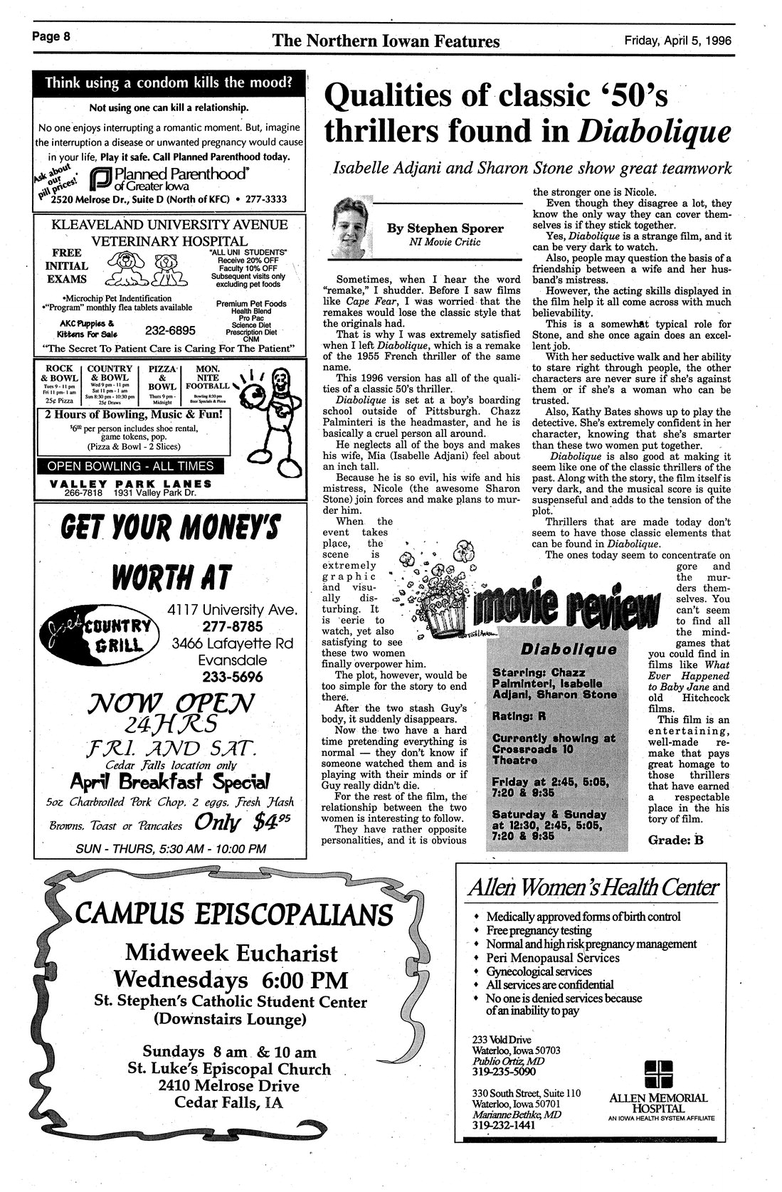 | Qualities of classic '50's thrillers found in "Diabolique"; Isabelle Adjani and Sharon Stone show great teamwork | A review of the movie "Diabolique" with Sharon Stone. |