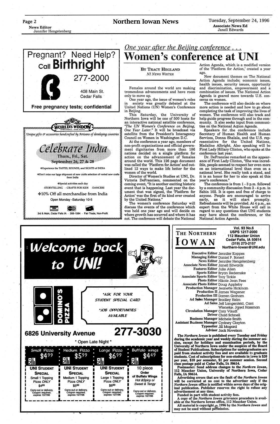 | Women's conference at UNI; one year after the Beijing conference¿ | UNI will be one host of interactive national satellite conference on women one year after the Beijing conference. |