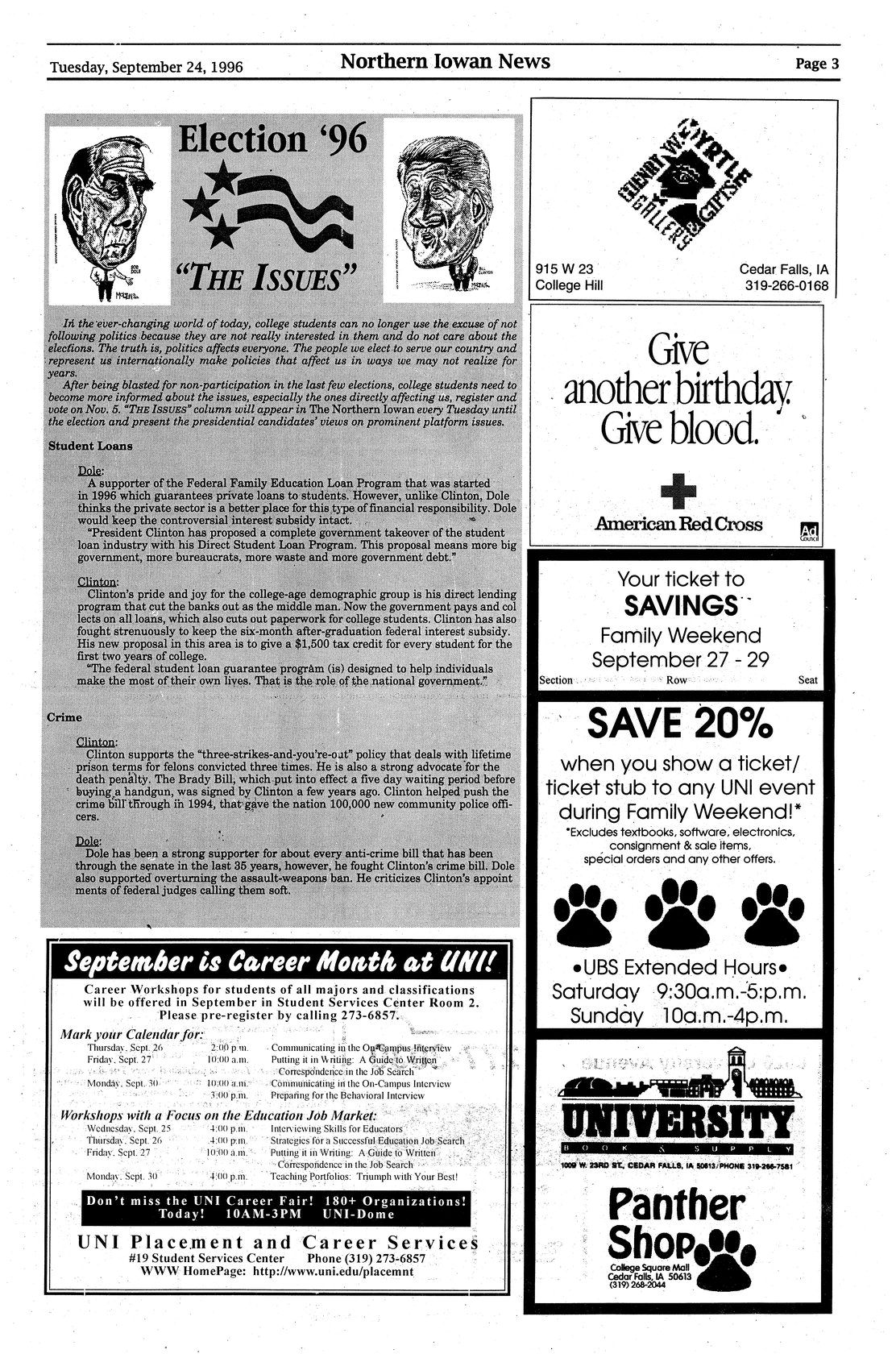 | Election '96 "The Issues" | President Clinton's and Bob Dole's views on student loans and crime are compared. |