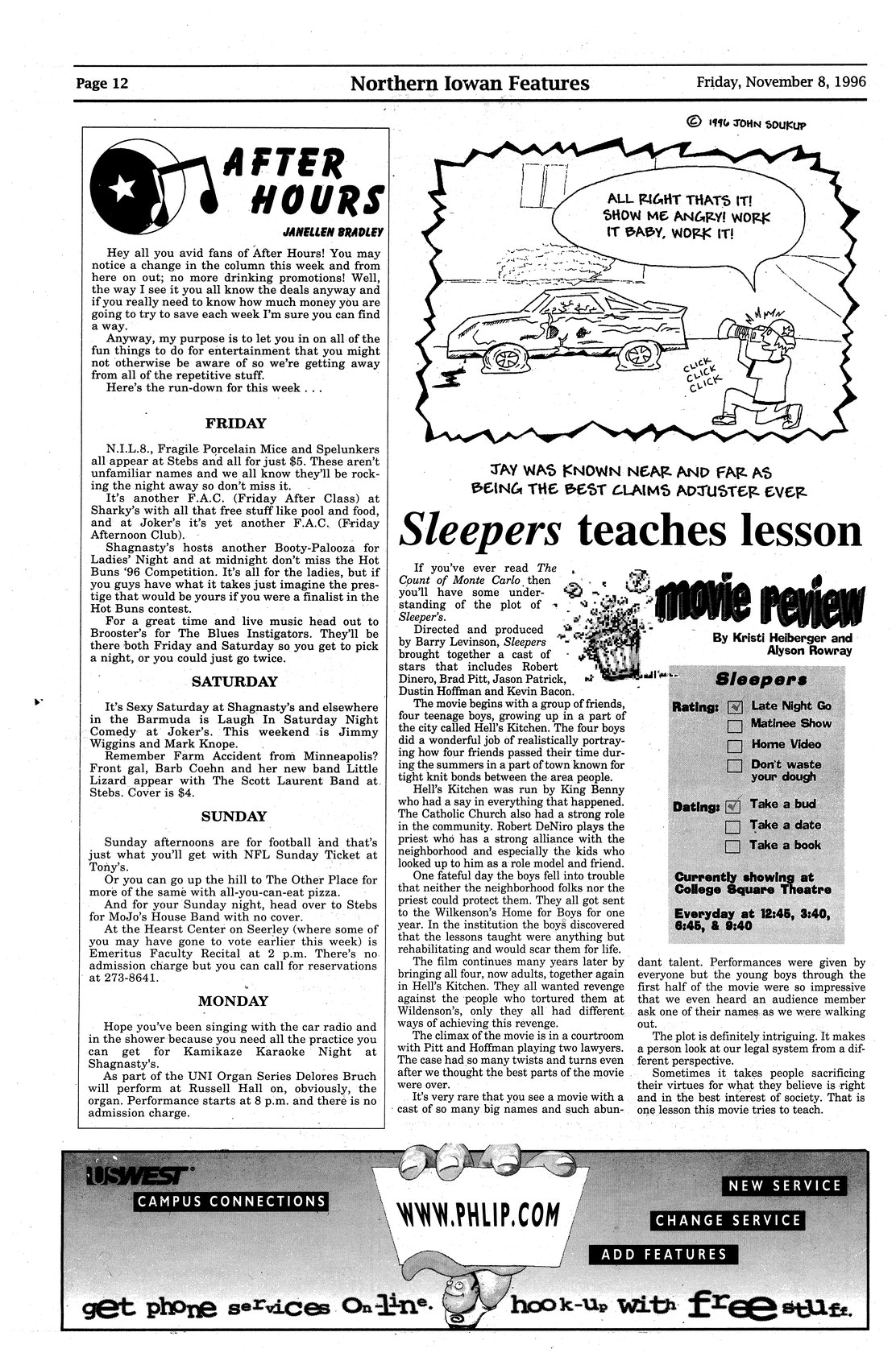 | "Sleepers" teaches lesson | Review of movie "Sleepers" with Robert Dinero, Brad Pitt, Jason Patrick, Dustin Hoffman, and Kevin Bacon. |