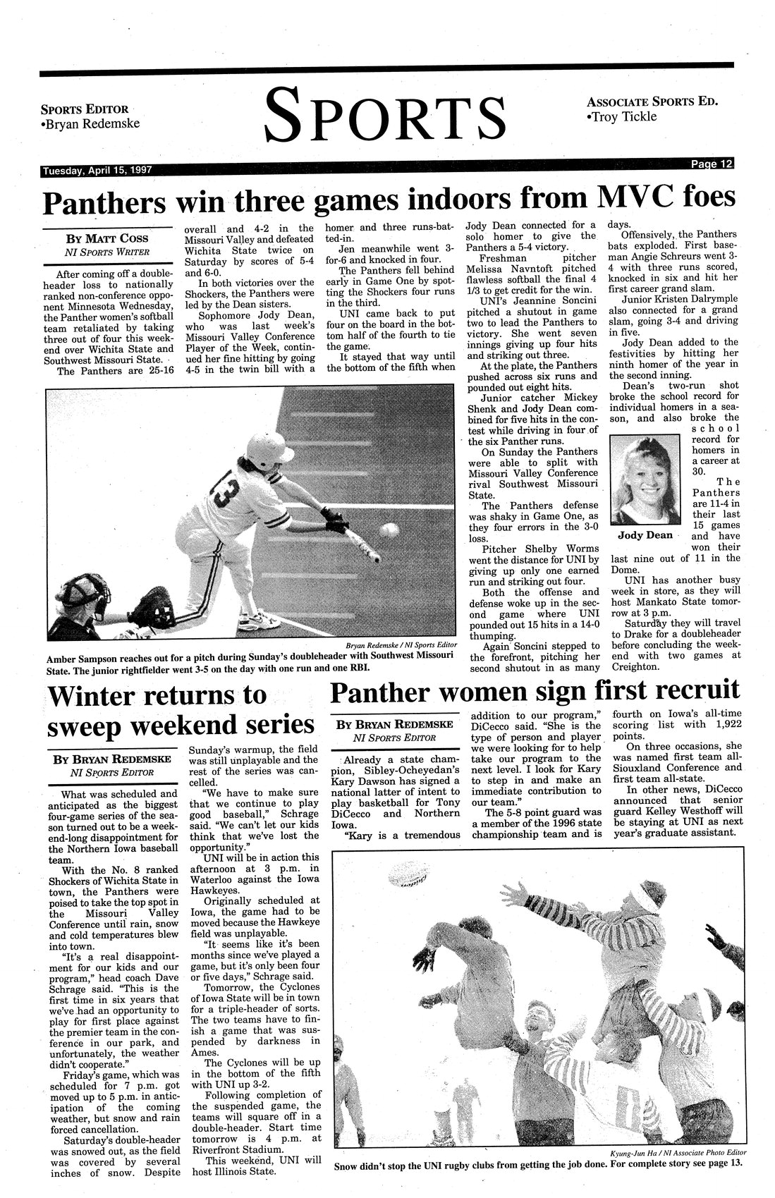 Panthers win three games indoors from MVC foes UNI won three of four weekend games against Wichita State and Southwest Missouri State; photo.