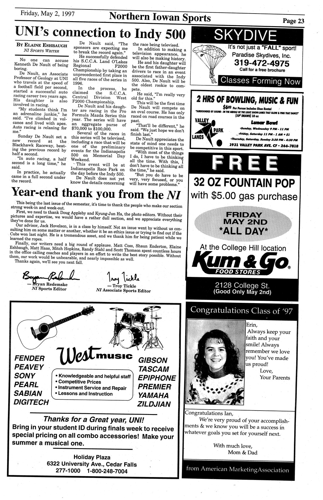 | UNI's connection to Indy 500 | Kenneth De Nault and his daughter will be racing at the Indianapolis Race Park the day before the Indy 500. |