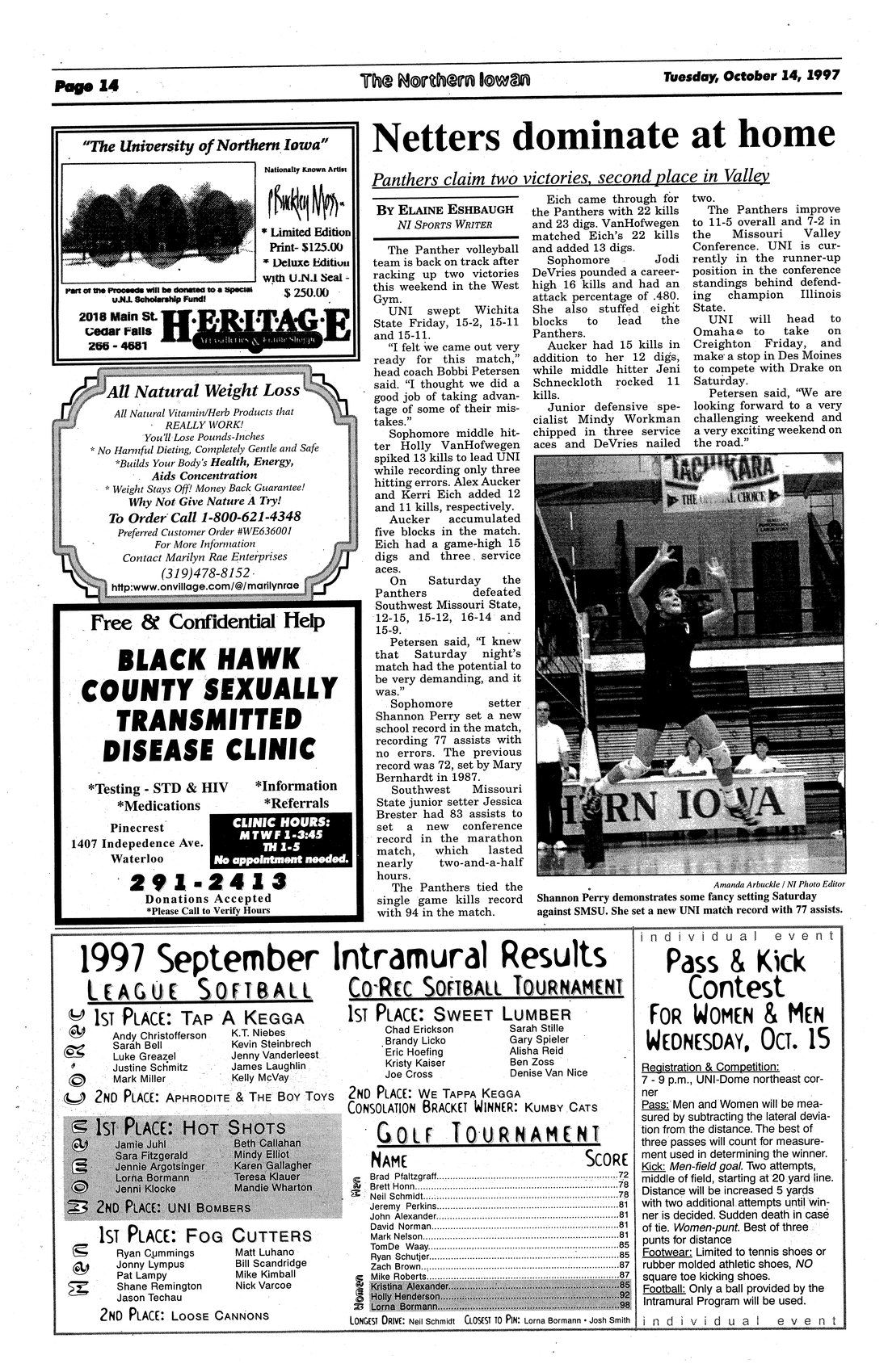 Netters dominate at home UNI beats Wichita State and Southwest Missouri in volleyball; photo.
