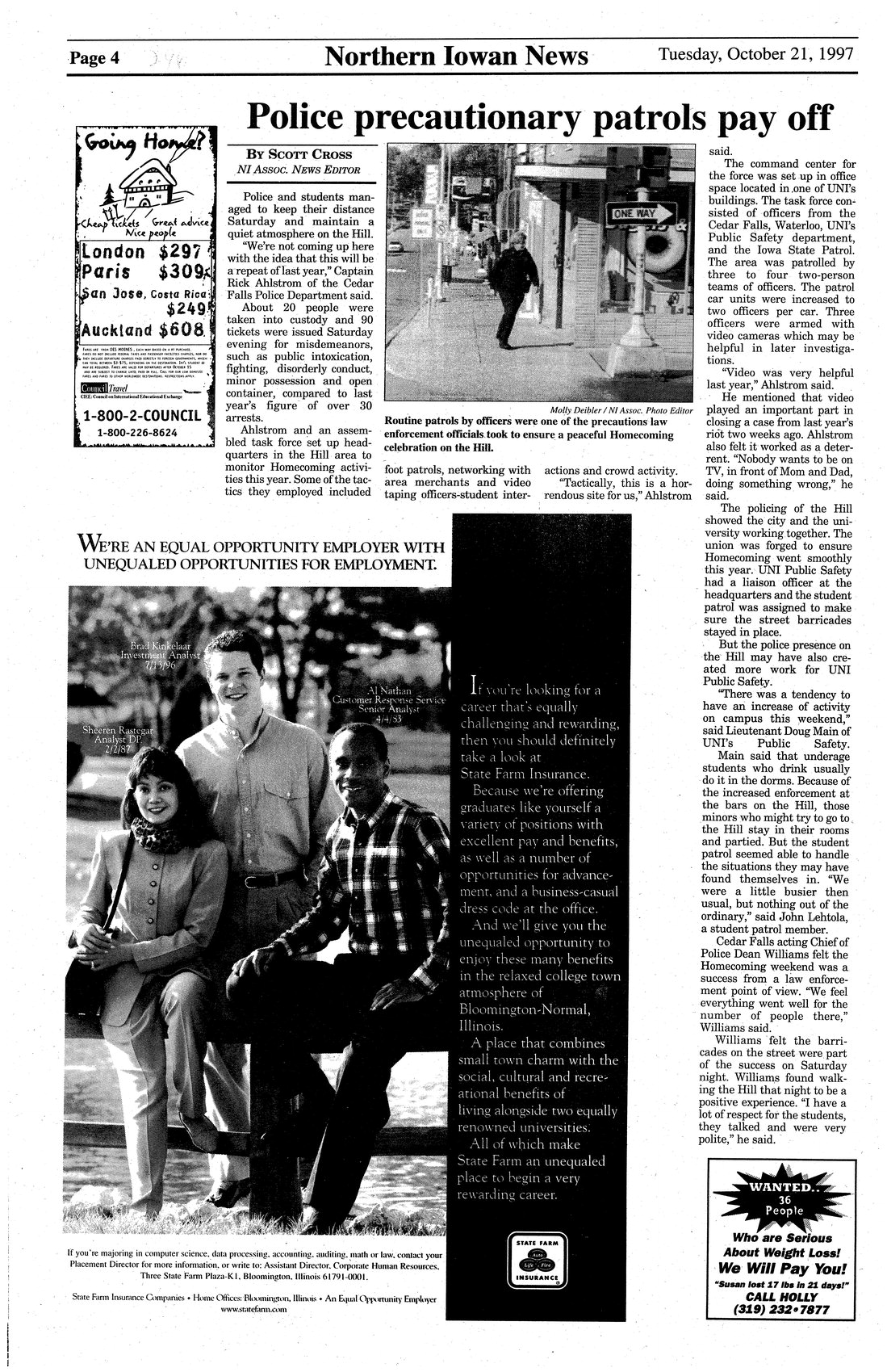 Police precautionary patrols pay off Description of police tactics used to prevent disturbances during Homecoming; photo.