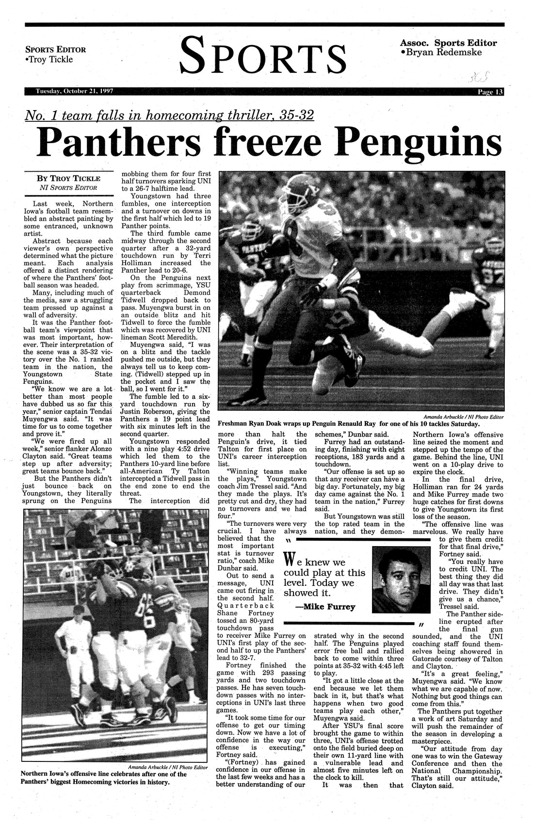 | Panthers freeze Penguins; No. 1 team falls in Homecoming thriller, 35-32 | UNI beats #1 Youngstown State in football, 35-32; photo. |