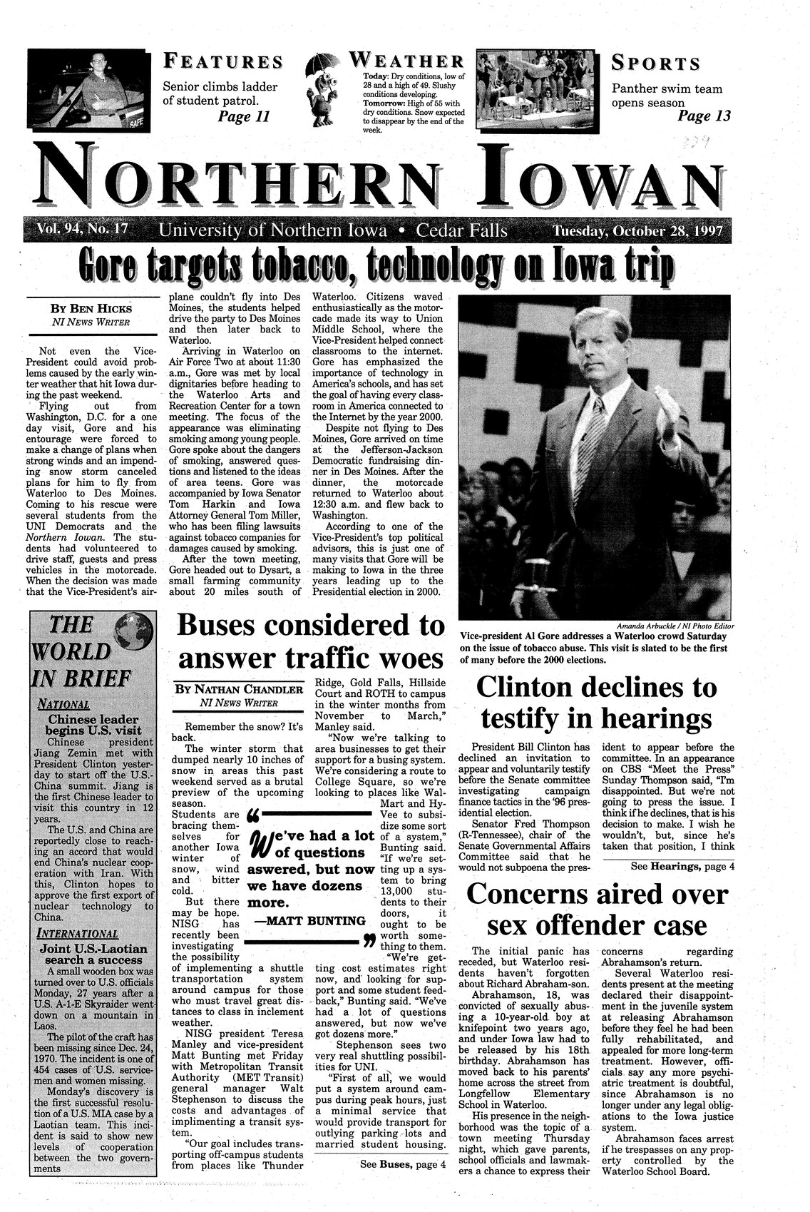 | Gore targets tobacco, technology on Iowa trip | Vice President Al Gore speaks on smoking in Waterloo; photo. |