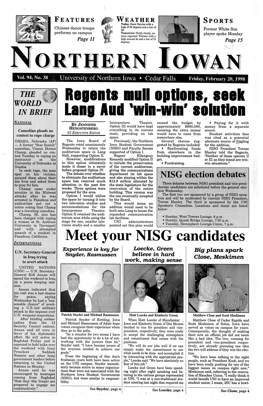 | Meet your NISG candidates; big plans spark Close, Meskimen | The renovation of Maucker Union will be a top issue for Matthew Close and Scott Meskimen if they are chosen as President and Vice President; photo. |