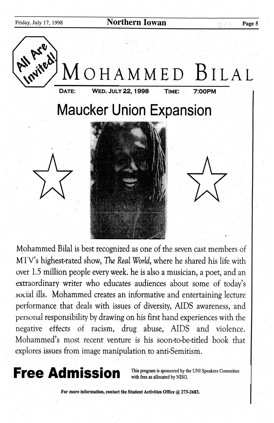 | Mohammed Bilal | Mohammed Bilal will speak in the Union July 22; no admission fee will be charged. |
