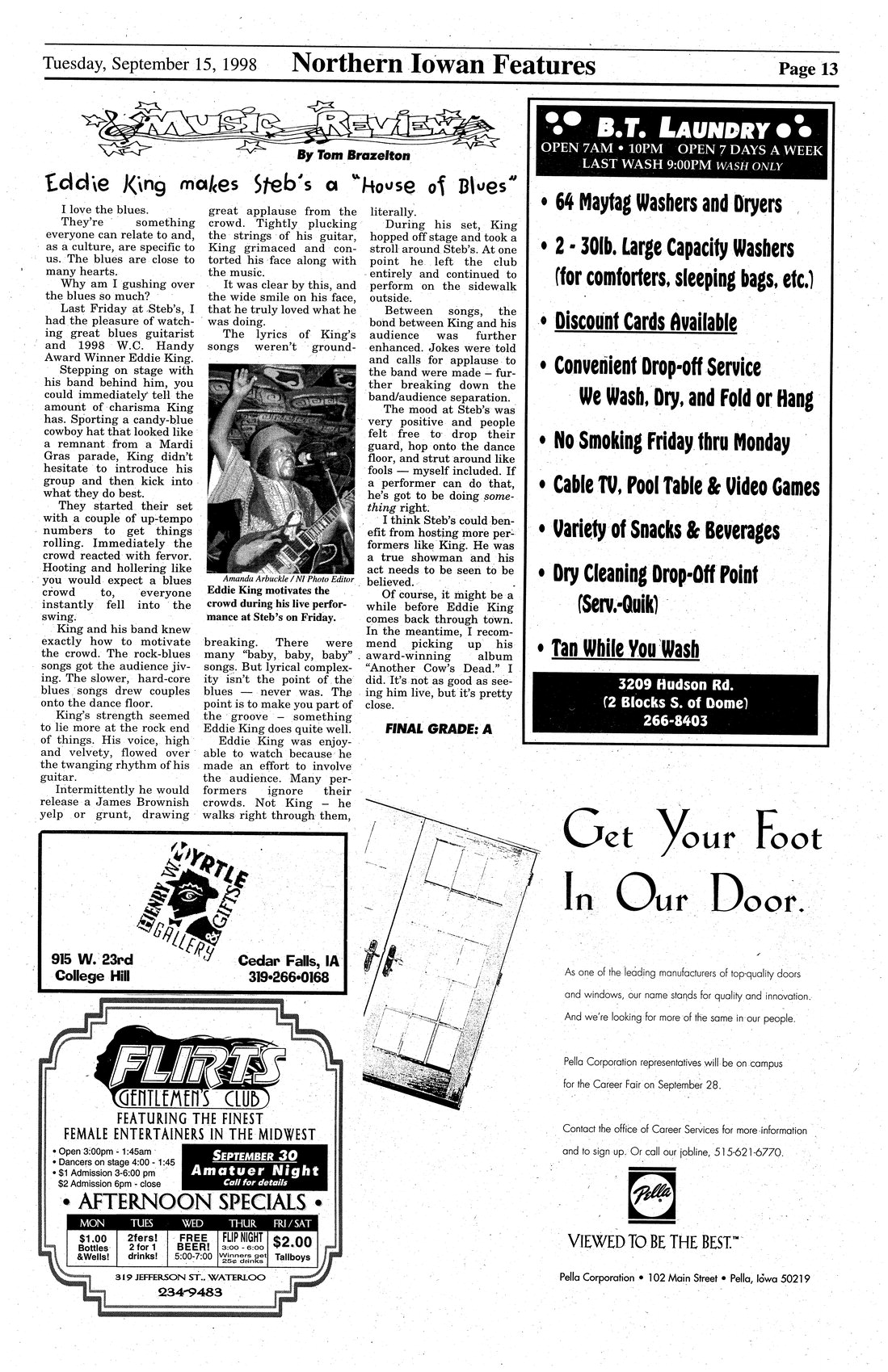 | Eddie King makes Steb's a "House of Blues" | Review of blues performer Eddie King; photo. |