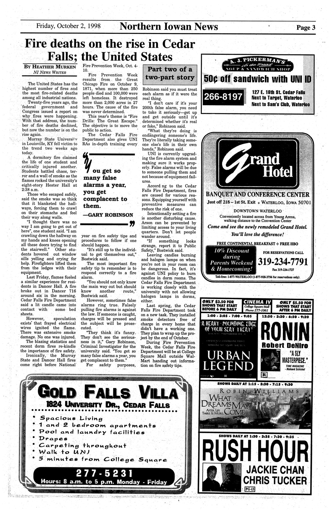 | Fire deaths on the rise in Cedar Falls; the United States; part two of a two-part story | Fire deaths are on the rise in the United States; students must take all fire alarms seriously. |