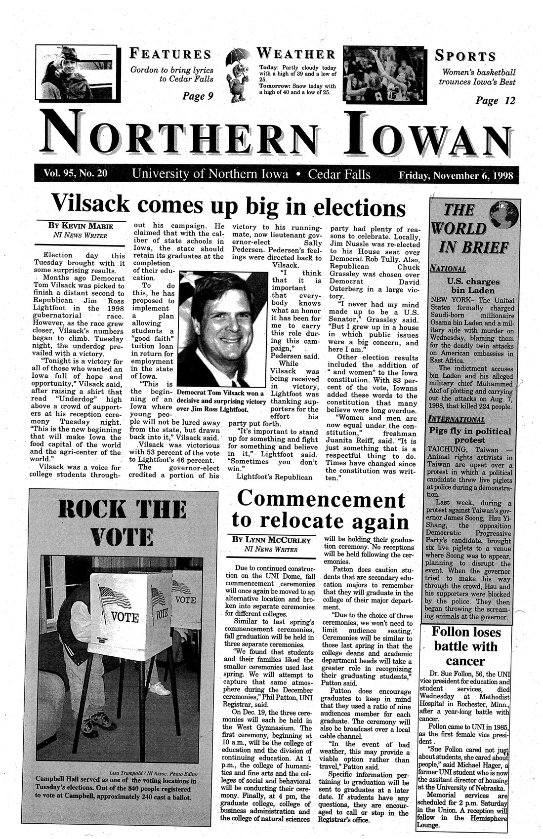 Vilsack comes up big in elections Democrat Tom Vilsack was elected Governor of Iowa; other election results are given; photo.