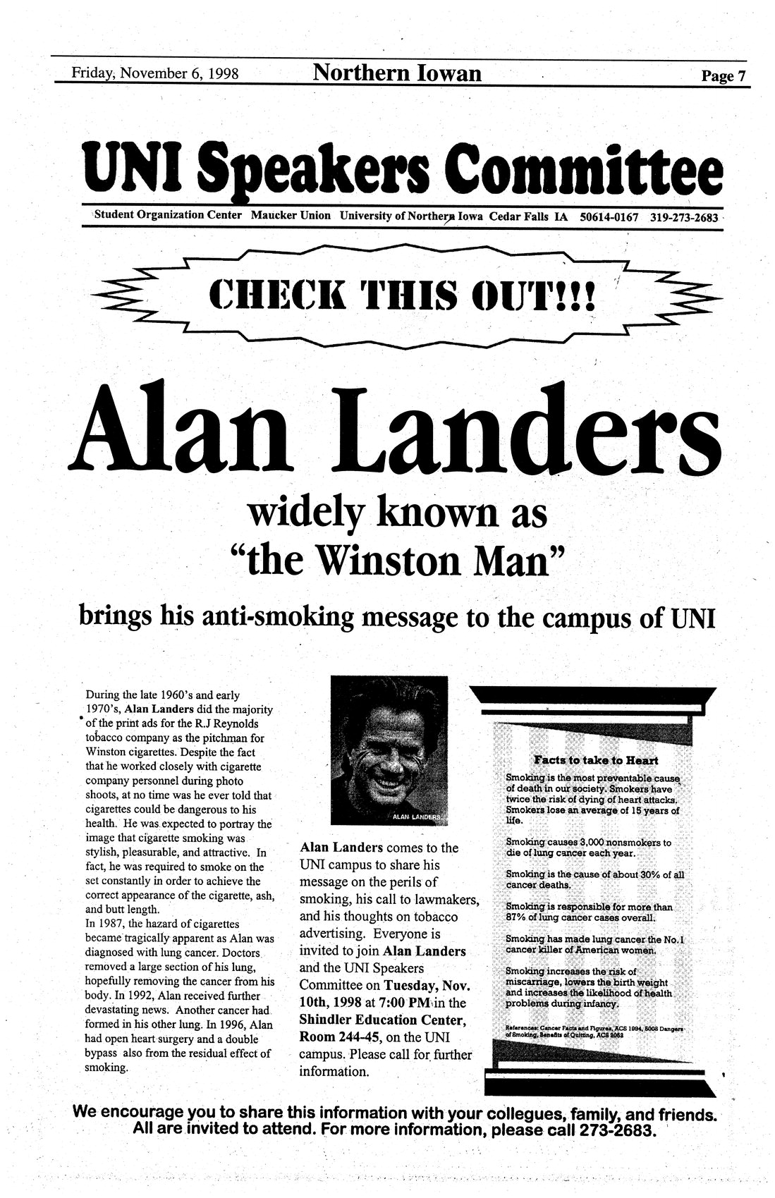 Alan Landers "The Winston Man" Alan Landers will speak on the dangers of smoking Tuesday November 10 in Schindler Education Center; photo.