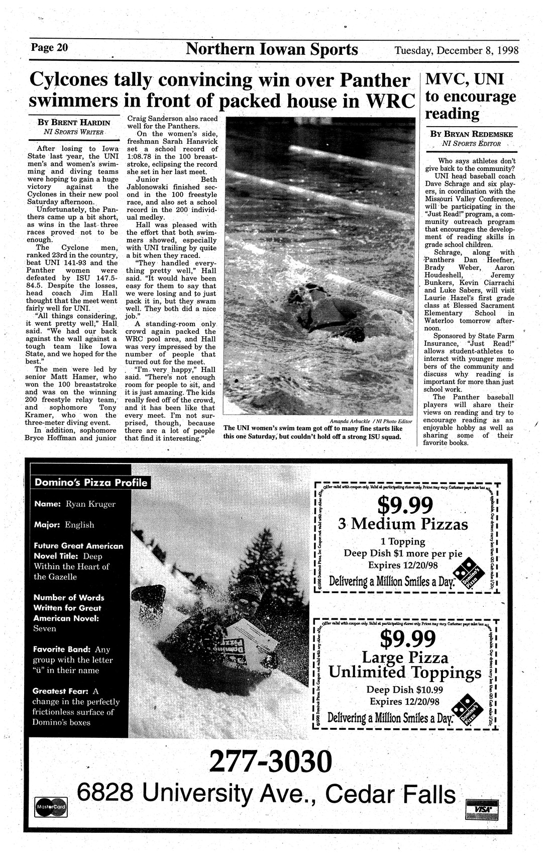 | MVC, UNI to encourage reading | Six UNI baseball players and Coach Schrage will participate in "Just Read!" and will visit Blessed Sacrament Elementary School tomorrow. |
