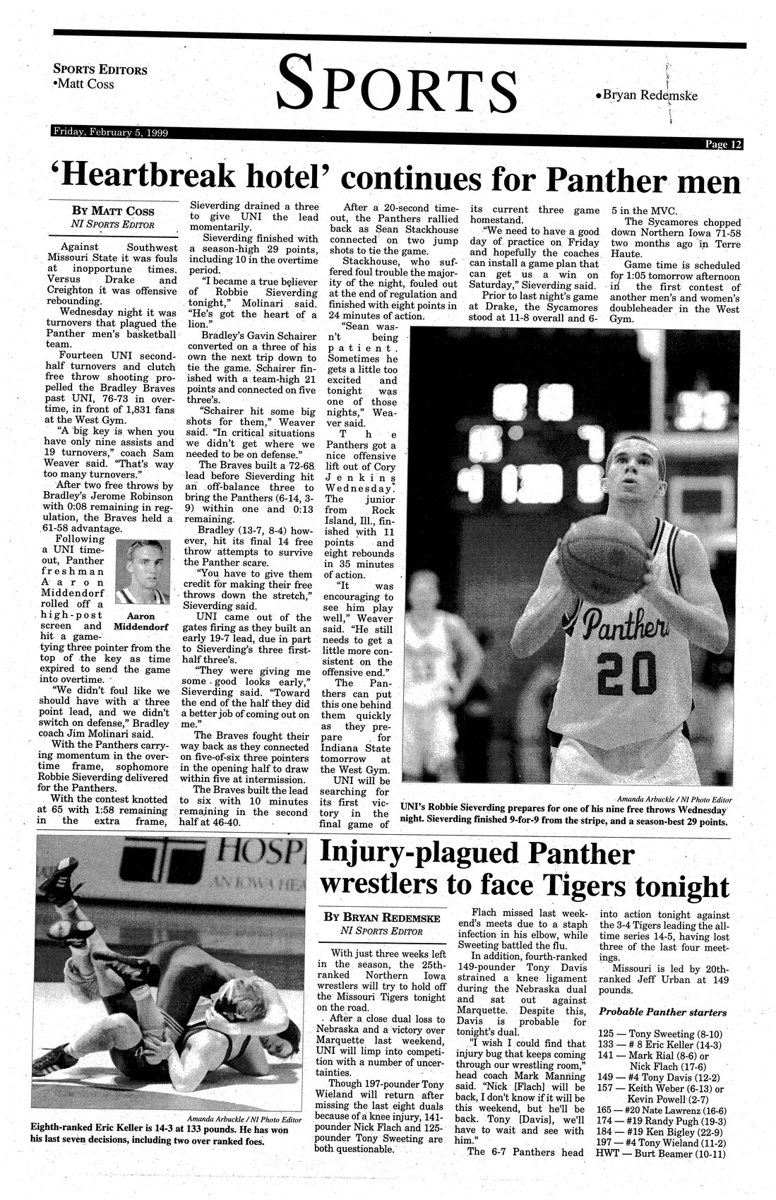 | 'Heartbreak Hotel' continues for Panther men | UNI lost to Bradley, 76-73, Wednesday; photo. |