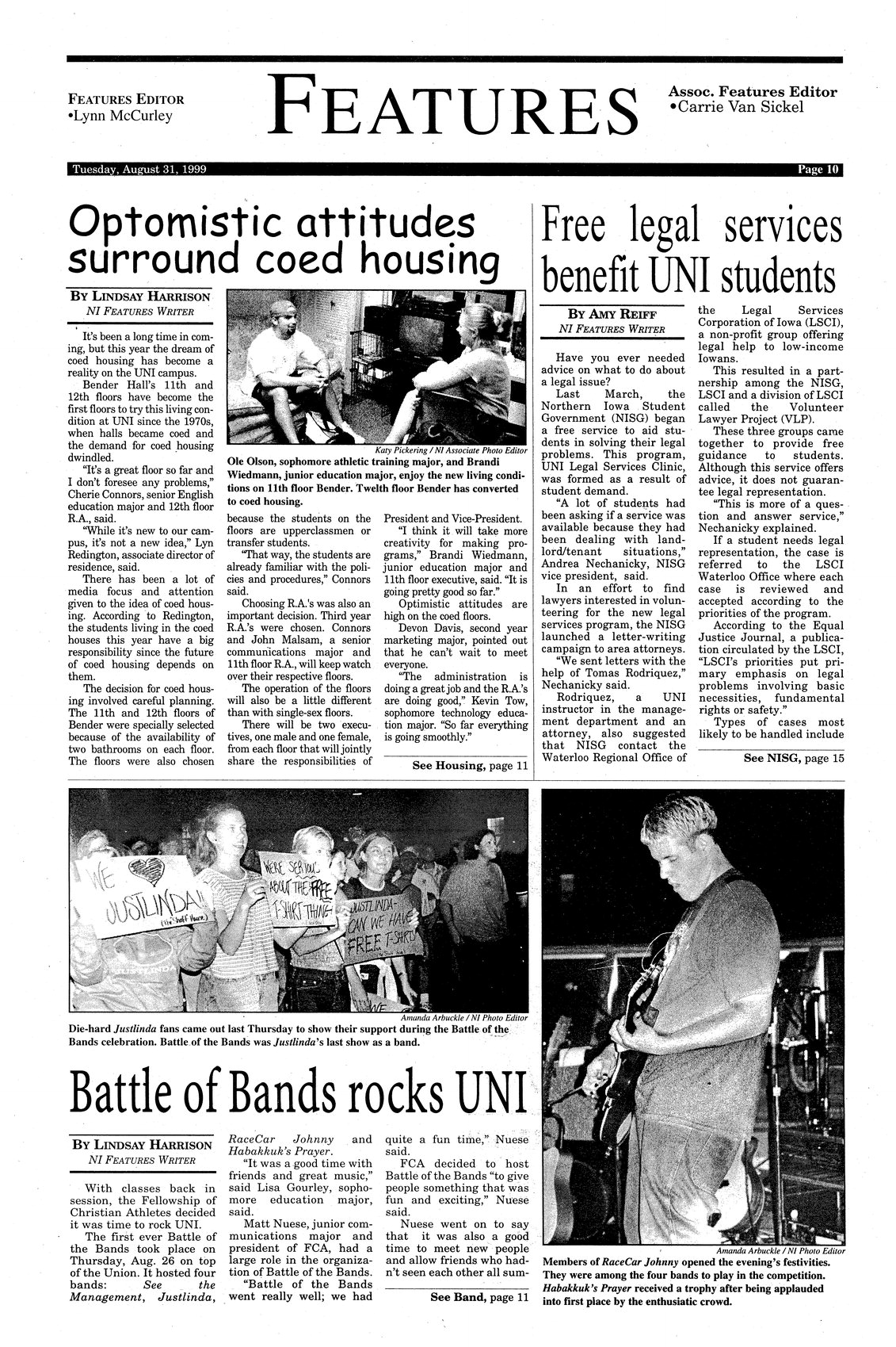 | Battle of Bands rocks UNI | Fellowship of Christian Athletes sponsors UNI's first Battle of the Bands on August 26; bands "See the Management', "Justlinda,RaceCar Johnny", and "Habakkuk's Prayer" performed; photo. |